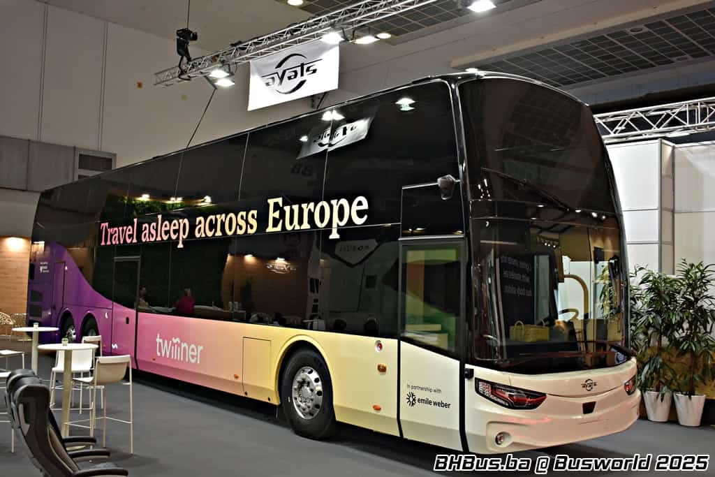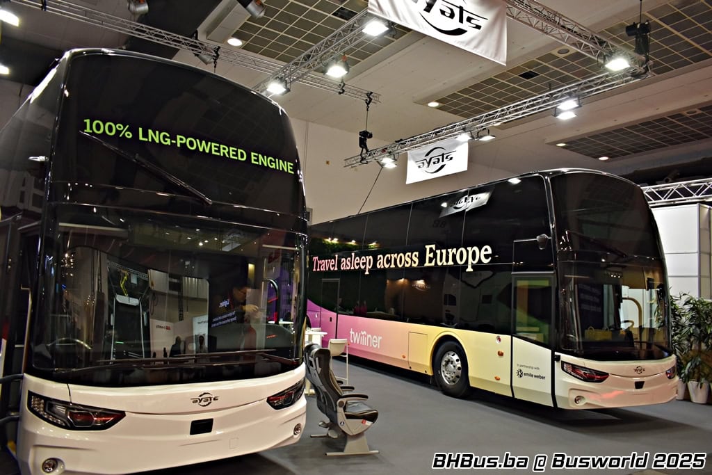 Španski proizvođač vozila Ayats poznat je po svojim dvospratnim autobusima za različite namjene na sajmu se predstavio sa dva modela. Izloženi su bili modeli Horizon, ali u različitim konfiguracijama. Prvi je bio nešto kraći međugradski Horizon sa dužinom od 14,4 metara i ukupnim kapacitetom od 89+1+1 i predviđenim mjestom za korisnike invalidskih kolica. Interesantno je da je troosovinski model opremljen Scania šasijom i Euro 6 motorom snage 410 KS, ali sa pogonom na LNG plin (Liquefied Natural Gas). Drugi izloženi model je bio dugačka verzija od 14,8 metara i u full turističkom VIP modu. Autobus je od švicarske kompanije Twiliner koja je predstavila inovativni koncept noćnog autobusa. Strateški partner i investitor je luksemburška kompanija Emile Weber, a linije su počele u septembru od Ciriha do Amsterdama. Shodno konceptu koji predstavljaju ove kompanije, autobus je luksuzno opremljen i ima samo 21 sjedište (u 2+1 rasporedu) plus vozačka posada. Nažalost, autobus je bio zaključan pa nismo mogli da vidimo unutrašnjost, ali ono što smo saznali je da je opremljen Mercedesovim Euro 6 motorom snage 510 KS i Mercedes GO 250-8 mjenjačem, da ima kapacitet od 627 litara te da oprema uključuje toalet, kutinju i svlačionicu. Vani je bio izložen i Ayats Horizon od kompanije Kearneys Coaches.