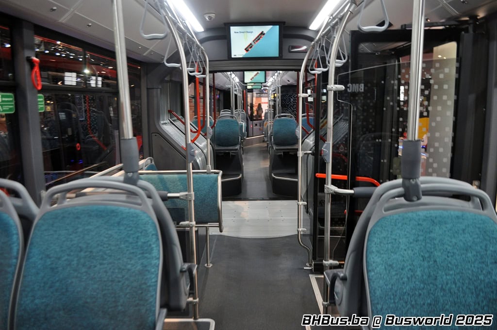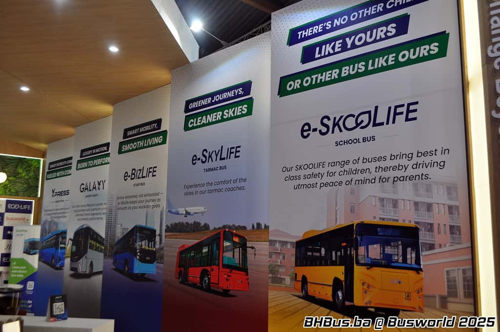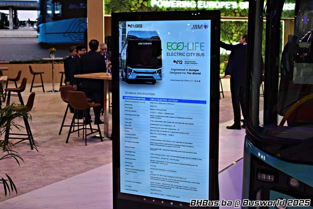 Na ovogodišnjem sajmu autobusa Busworld se predstavio i indijski proizvođač JBM. Kompanija simpatičnog imena za naše uslove se predstavila sa jednim modelom – gradskim električnim autobusom Ecolife, koji je bio tu i prošle godine. Međutim, malo smo ostali iznenađeni zbog natpisa na štandu vezanih za bus, pa nismo na kraju bili sigurni da li se izloženo vozilo naziva Ecolife, E12 ili E-Verse… U svakom slučaju vozilo je standardne dvoosovinske izvedbe kapaciteta 31 sjedišta plus vozač i plus prostor za invalidska kolica. Osovine dolaze iz ZF-a, kočioni i sigurnosni sistem iz Wabca dok je projektovano da vozilo ima domet od 300 km na jednom punjenju. Štand je bio prilično informativan s obzirom da su bile dostupne informacije i o ostalim modelima koji su u ponudi uz ovaj izloženi. Za kraj željeli bismo pohvaliti dizajn sistema kamera koji je jedan od boljih i najmanjih koji smo vidjeli, tako da ne narušava cijelokupan izgled vozila, a samim tim i aerodinamiku. Također, obratite pažnju na zadnja svjetla – upravo su ona bila hit cijelog sajma pošto je baš mnogo proizvođača koristila ista u različitim pozicijama, kao što se može vidjeti i kod BMC modela u galeriji ispod.