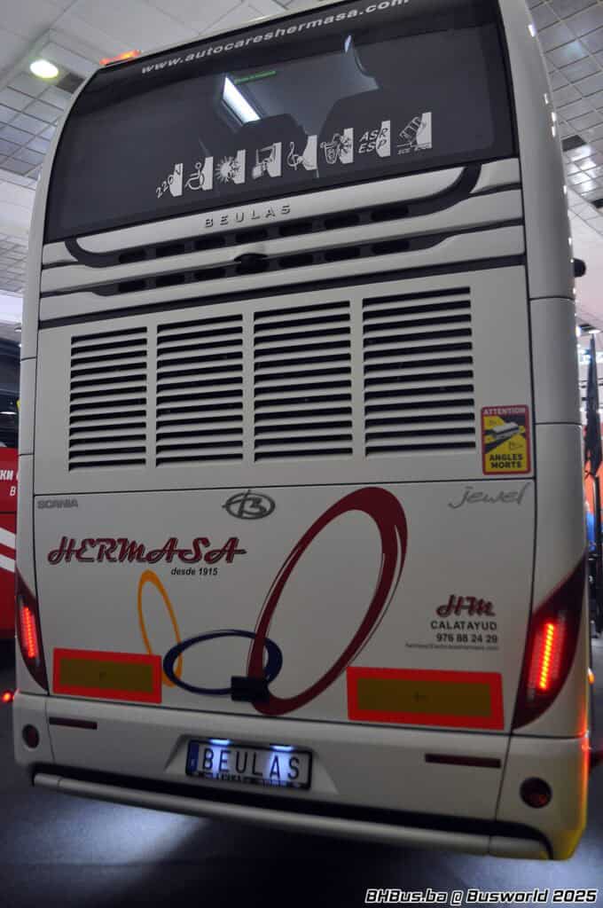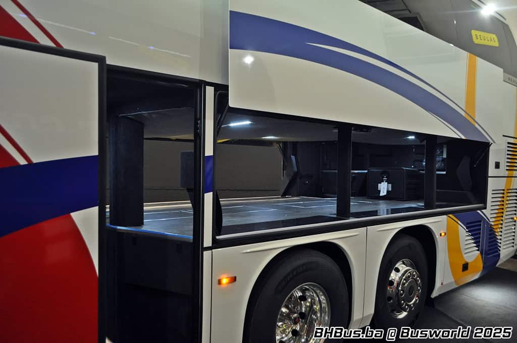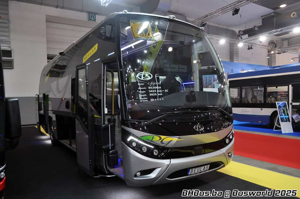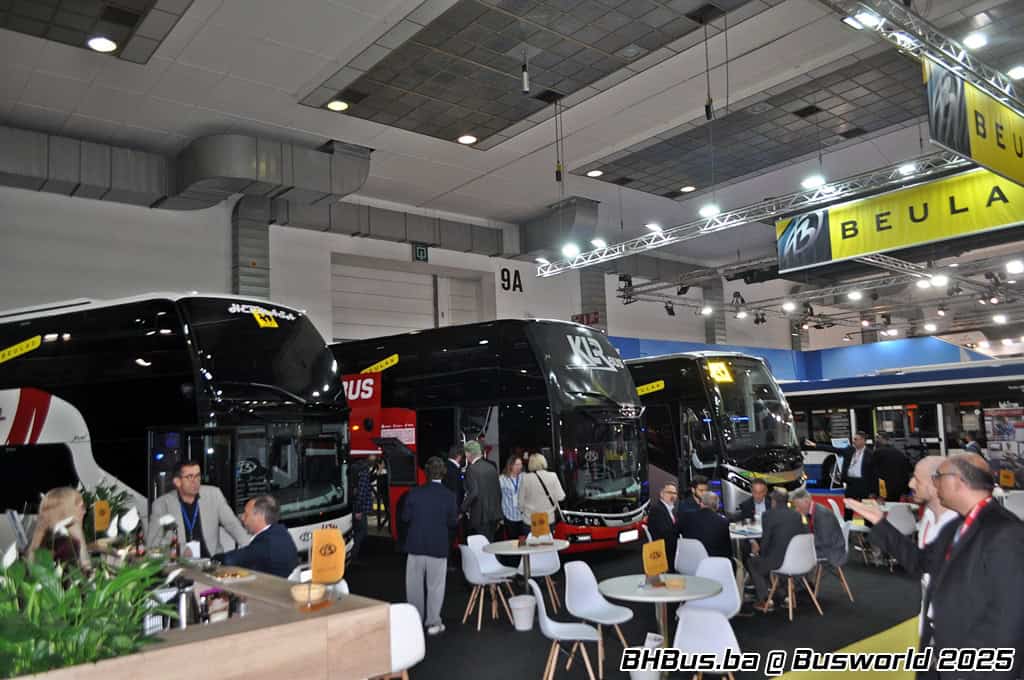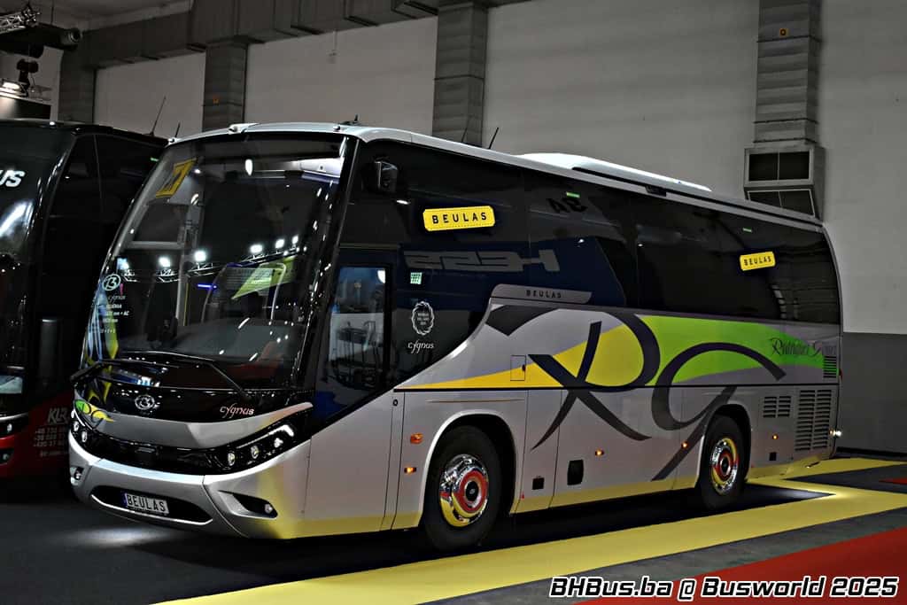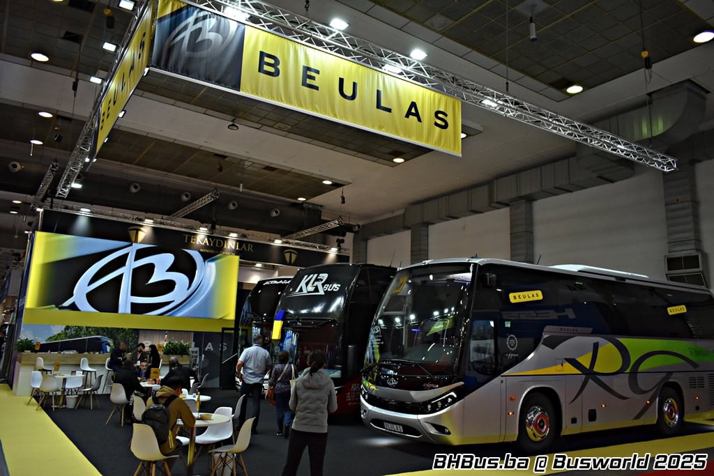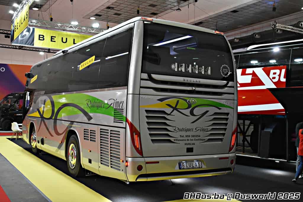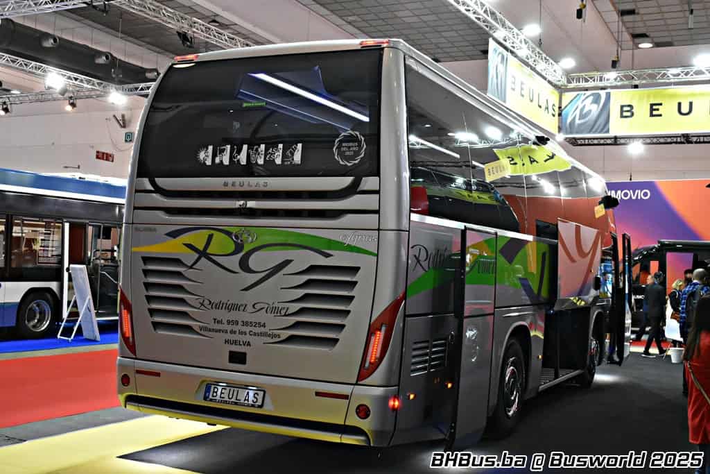 Sljedeći na listi je španski proizvođač vozila Beulas koji se ove godine predstavio sa tri vozila, a postavka je bila ista kao i na Busworld 2023 – Jewel, Glory i Cygnus. Svi modeli donijeli su neka značajna unaprijeđenja, koja je prije svega ogledaju u nedostatku klasičnih retrovizora. Predstavljeni dvospratni Jewel je bio na Scania šasiji i konfigurisan sa 82 sjedišta + vozač + suvozač. Vozilo je dužine 14,1 metar i za tu dužinu ima odličan kapacitet, ali je prtljažni prostor ono što je veliki plus. Naime, vozilo ima toliki prtljažni prostor da se kroz bočna vrata komotno može ući unutar prtljažnog prostora ili prevedeno u brojke – 13,13 m3. Od ostale opreme su tu još toalet, kuhinja, klima, dodatno grijanje i frižider. Model Glory predstavlja kategoriju tzv. “jedan i po spratni autobus” ili overdeker, gdje je vozač fizički odvojen od ostatka putničkog prostora. Konkurencija u ovom segmentu nije velika pa Beulas ovdje stoji prilično dobro. Predstavljeno vozilo je ukrajinskog prevoznika KLR bus i ima dužinu od 14,98 metara i ima MAN šasiju. Zahvaljujući izvedbi, ima kapacitet od 62+2+1 sjedišta uz napomenu da se dio iznad vozačke posade odlikuje VIP sjedištima. Najmanji model na štandu je bio Cygnus, koji je za razliku od prošlog sajma i dužine 10,5 metara, sada bio 9,8 metara dužine. Zajednička je ostala Scania šasija i motor, ali je kapacitet sjedišta povećan pa iznosi 39+1+1. Vrijedi istaći i da je ponio titulu španskog midibusa godine za 2025.