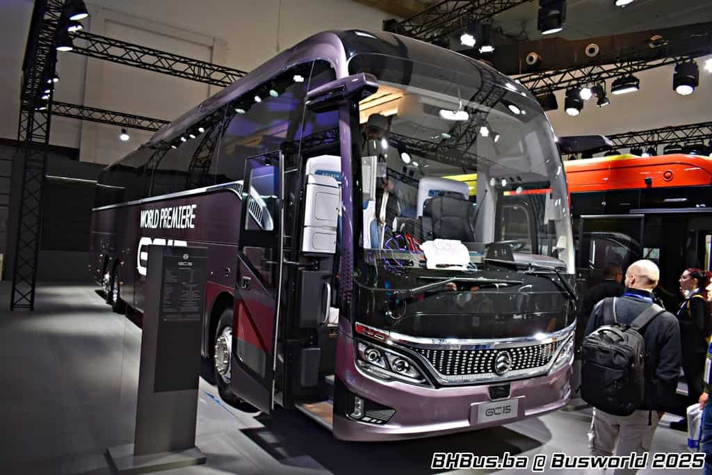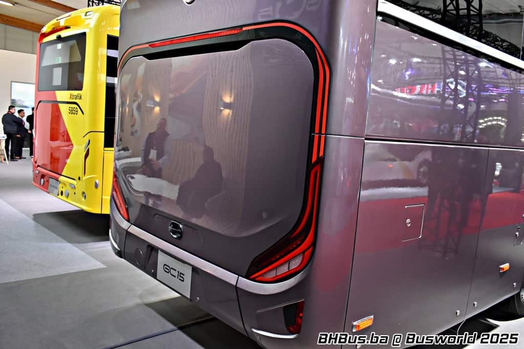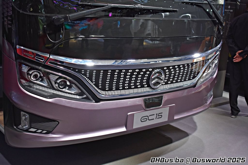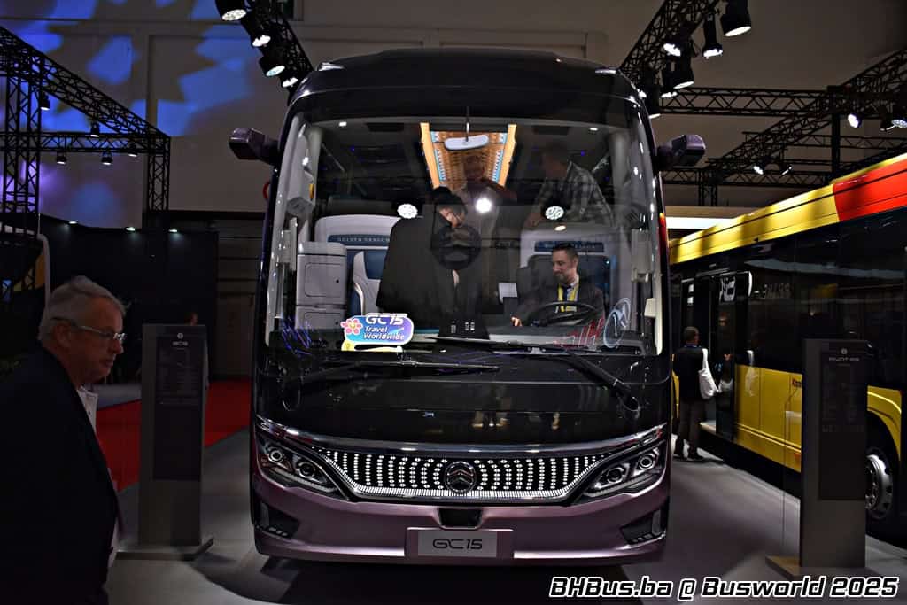 Ipak, sva pozornost je bila usmjerena na visokopodni električni autobus GC15. Radi se o vozilu dužine 14,8 metara kapaciteta čak 62 putnika. Interesantno je da je reklamiran kao električni turistički autobus, a na letku pored busa je klasifikovan kao Class I/Class II bus. Opremljen je baterijom proizvođača CATL i kažu da na jednom punjenju mogu preći 600 km. Vozilo ima dosta evropskih komponenti, a ni dizajn mu nije loš. Posebno treba pohvaliti diodnu rasvjetu ispod bočnih prozora sa vanjske strane što je svakako lijep dodatak koji sigurno po noći izgleda još ljepše. Nažalost, zbog velike gužve u vozilu, nismo bili u mogućnosti slikati unutrašnjost.