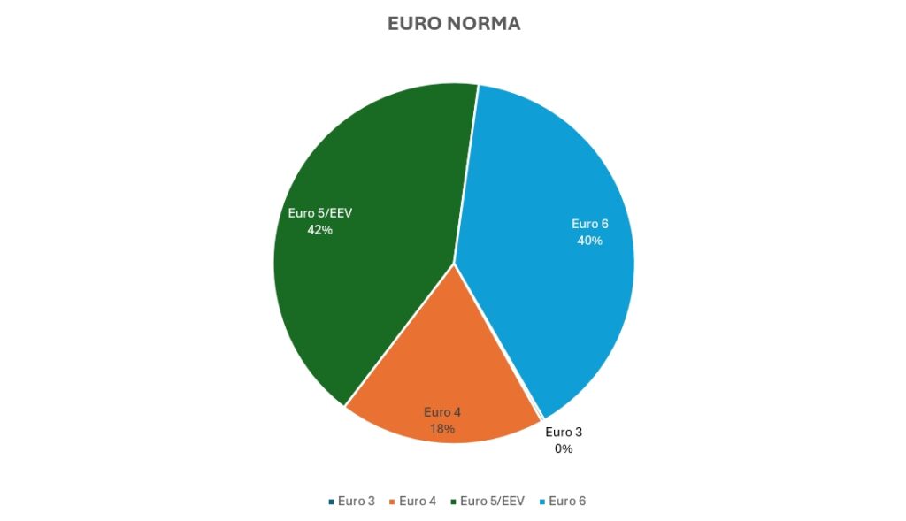 Kada govorimo o euro normama, sve je prilično jasno i situacija je ista kao i prošle godine. Najbrojnija su vozila sa Euro 5/EEV motorima i to njih 161 (2024. – 169), a slijede ih Euro 6 sa 152 (2024. – 108) i Euro 4 sa 71 vozilom (2024. – 74). Dakle vidi se porast broja Euro 6 vozila, dok Euro 4 polako opada. Ubilježeno je i jedno vozilo sa Euro 3 motorom, ali je situacija bila specifična pošto je autobus radio u sklopu NATO operacije, pa je dobio posebnu dozvolu za registraciju na domaće bh. tablice. Nažalost, predvidjeli smo da će tokom 2025. godine vozila sa Euro 6 motorima preuzeti primat u ovom segmentu što se nije desilo, uprkos povećanju broja. Vidjet ćemo da li će se to desiti tokom 2026. godine. U tome veliku prepreku predstavlja i uvoz gradskih i prigradskih vozila koja su uglavnom Euro 4, pošto nema ekonomske računice uzimati taj tip sa Euro 6 motorima zbog cijene i održavanja.