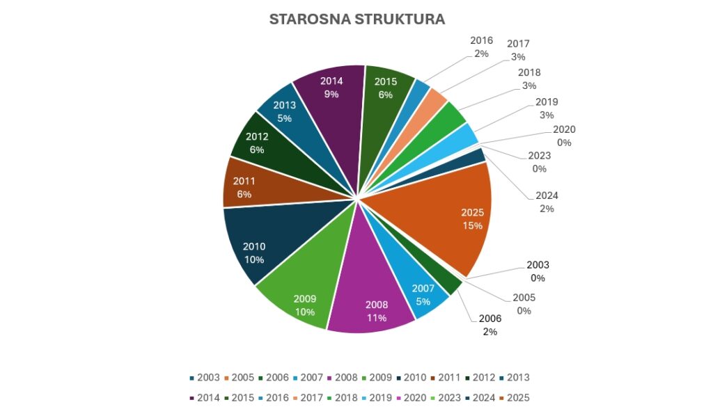 Starosna struktura vozila nastavlja da se poboljšava, ali i dalje pretežno dominiraju vozila iz 2008. – 2011. godine (posebno 2008. sa 42 vozila). Ipak, lijepo je vidjeti da je u 2025. godini bili registrovano 56 vozila koja su proizvedena te iste godine. Interesantno je da su 2008. I 2009. godina ubilježene kao godine proizvodnje koje su ubilježila registraciju svaki mjesec. Spomenuli smo da je 2008. godina bila godina sa najviše vozila, ali s druge strane 2021. I 2022. godina nisu ubilježile ni jedno vozilo, što nije iznenađenje s obzirom da su to kovid godine. Najviše registrovanih vozila sa različitim godinama proizvodnje smo imali u aprilu – 16, dok smo najmanje imali u junu – sedam. Tri mjeseca – maj, juli, august – smo imali po 10 registracija vozila sa istom godinom proizvodnje, a posebno raduje činjenica da se u julu i augustu radilo o kompletno novih vozilima. Nakon što je prošlih godine utvrđen pad registracija vozila na plinski pogon (CNG) prošla godina je bila vrhunac pošto su apsolutno sva vozila registrovana po prvi put bila na dizelski pogon.
