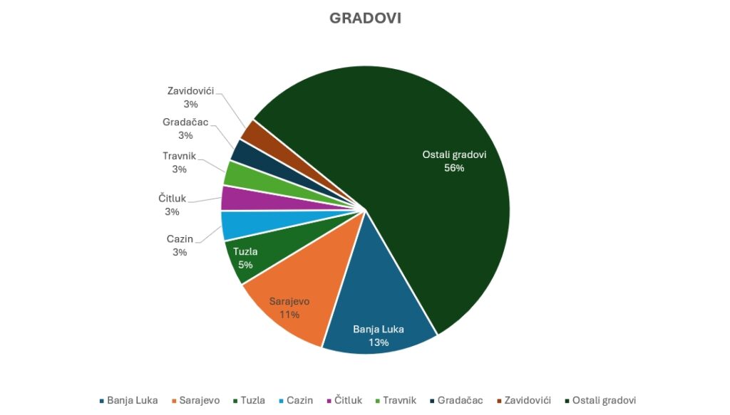 Tokom prošle godine najbolji mjesec je bio maj kada je stiglo 46 vozila, a najlošiji juni sa 18. To je i očekivano s obzirom da sezona počinje u maju dok u junu već svi rade i kupovina te obnova voznih parkova nije toliko atraktivna. Vozila su stizala u 70 bh. gradova, što je tačno isti broj kao i prošle godine, ali i dalje manje u odnosu na rekordnu 2022. godinu (72). Najviše različitih registracija u različitih gradova je bilo tokom aprila – 27 gradova, a najslabiji je bio juni kada je 18 vozila registrovano u 11 gradova. Standardno već najviše vozila je stiglo u Banja Luku (51), Sarajevo (44) i Tuzlu (20), dok su donekle Cazin (13) i Travnik (11) iznenadili. Rekorder po broju registracija u jednom mjesecu je Tuzla, koja je u maju imala 12 registracija. S druge strane, Banja Luka je jedini grad koja je svaki mjesec imala po minimalno jedno registraciju.