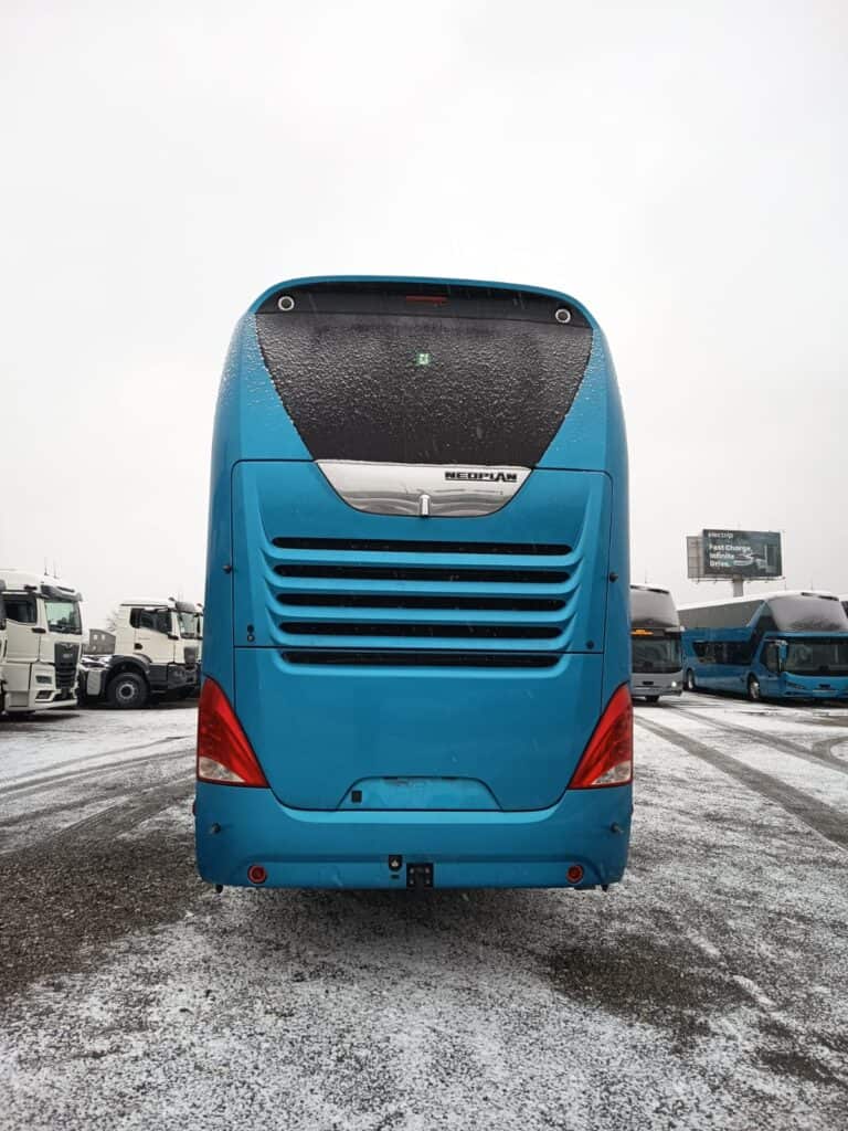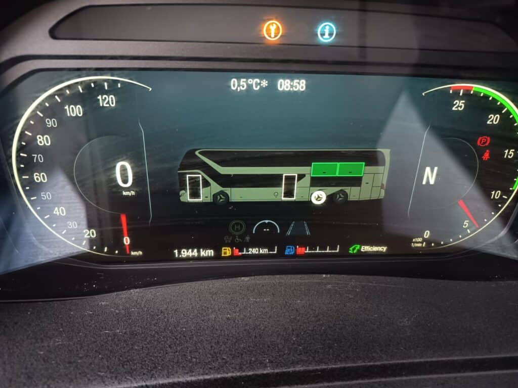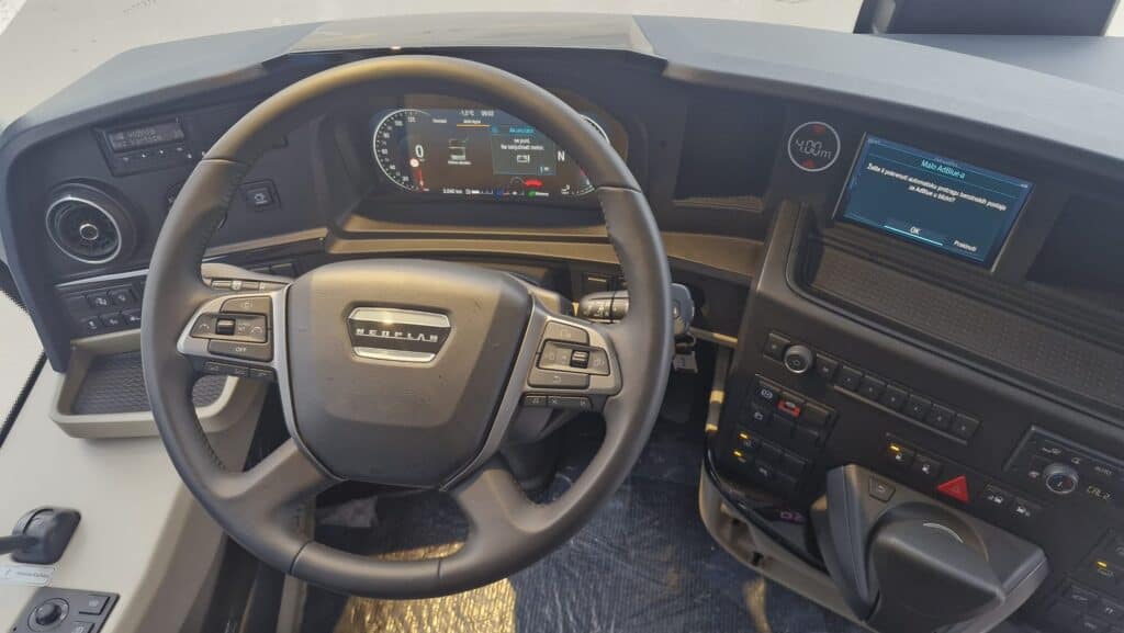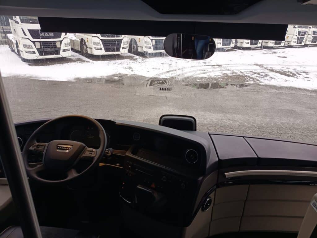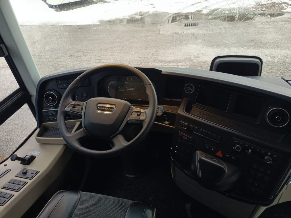 Vozački prostor je također značajno promjenjen zadnjih godina i unaprijeđen je sa još ergonomskijim značajkama. Sjedište vozača je Isringhausen ProActive 2 koje nudi leđni i bočni anatomski profili s podešavanjem i sigurnosnim pojasom u tri tačke vezanja. Preklopivi nasloni za ruku su sa obje strane, a vozač će se osjećati ugodno zahvaljujući opcijama grijanja i hlađenja sjedišta. Cijelo sjedište je urađeno u luksuznoj izvedbi sa kožom baš kao i suvozačko sjedište. Stub upravljača je podesiv po visini i nagibu, a centralno mjesto zauzima redizajnirani multifunkcionalni volan, također u kožnoj izvedbi i stiliziranim Neoplan logom. Tu je i digitalni 12-inčni kokpit koju čini nova izvedba instrument ploče i glavnog informacijskog displeja uz dodatni 7-inčni displej u boji višefunkcijskim upravljačem MAN SmartSelect, o čemu ste ranije mogli detaljnije da čitate na našem portalu.