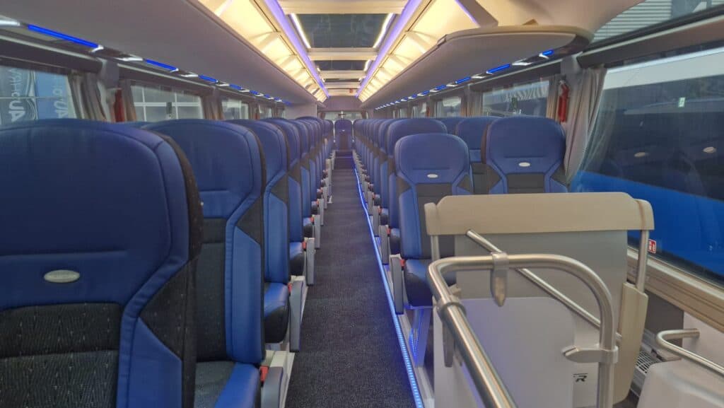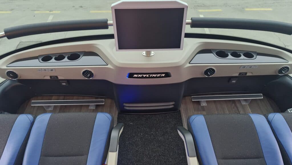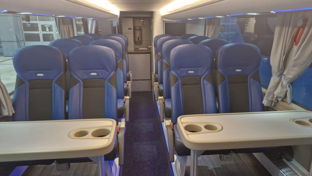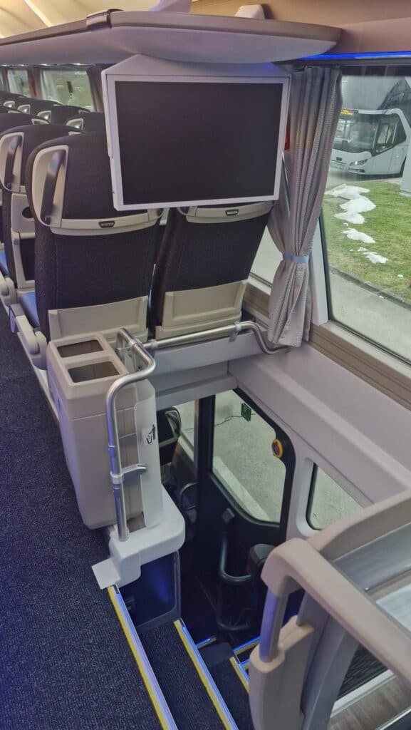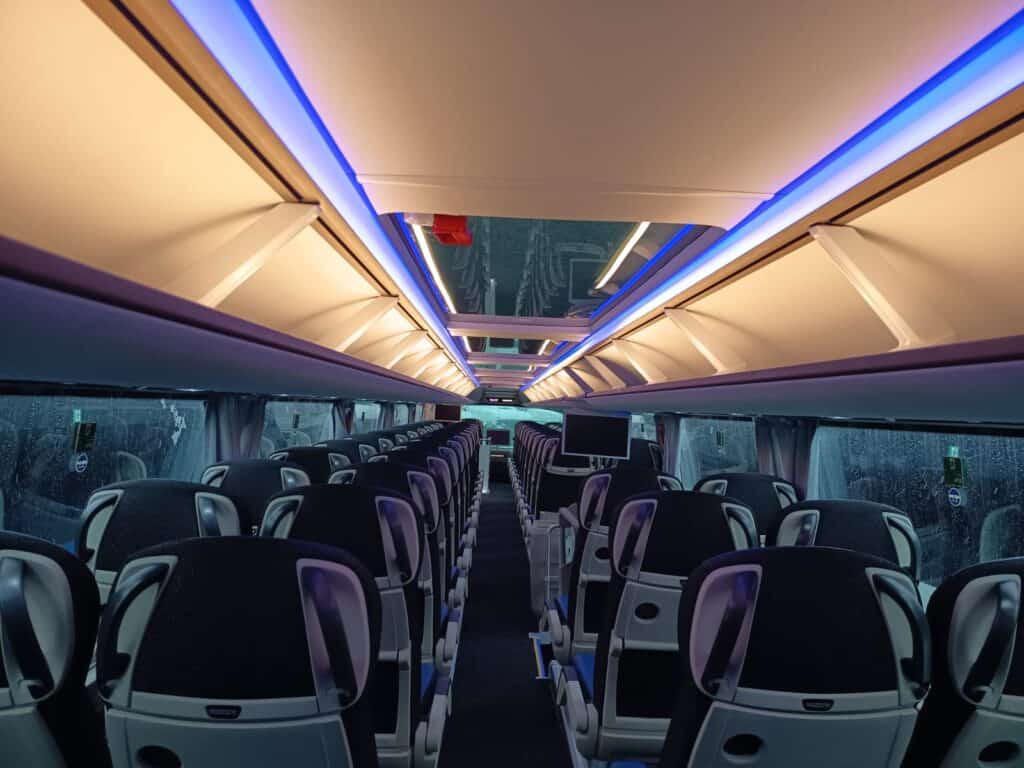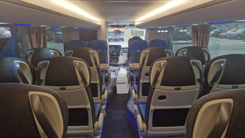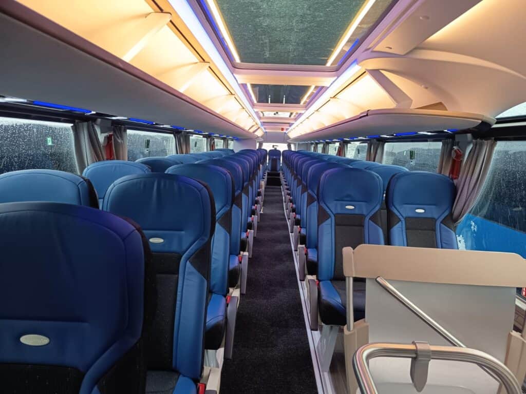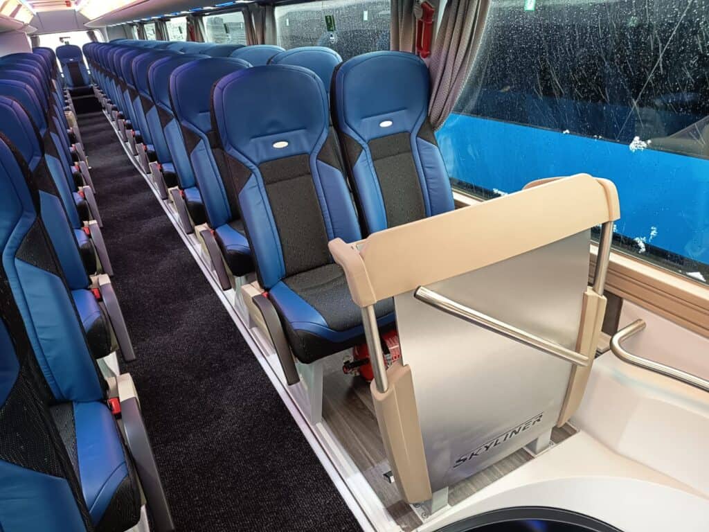 Unutrašnjost autobusa prati vanjski izgled gdje plavi tonovi dominiraju i čine jednu perfektnu vizuelnu cjelinu. Obje etaže su urađene u imitaciji drvenog poda, a krov je urađen u panoramskoj izvedbi koji će putnicima pružiti lijep pogled i dovoljno svjetlosti. Novi autobusi imaju ukupan kapacitet iznosi 83+1+1 sjedišta. Model i izvedba sjedišta su PremiumLine First i u plavo-crnoj izvedbi izgledaju zaista odlično. Sjedišta su u kombinaciji crne tkanine i plave kože, kao i na ranije isporučenim MAN autobusima, o čemu ste mogli čitati na našem portalu, sa sigurnosnim pojasevima u dvije tačke vezanja. Nezaobilazni logo Neoplan je ušiven na naslon svih sjedišta. Sva sjedišta imaju dvostruko bočno tapeciranje od kože što će poboljšati udobnost putnika posebno na dugim relacijama. Sjedišta su opremljena još sa preklopnim naslonima za ruke, preklopnim stolićima, mrežice za novine, osloncima za noge i naravno podesivim naslonima, gdje vrijedi istaći automatsko podešavanje sjedećeg dijela prilikom podešavanja naslona.