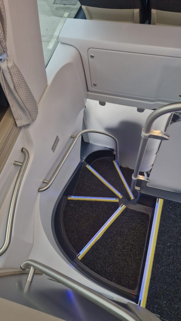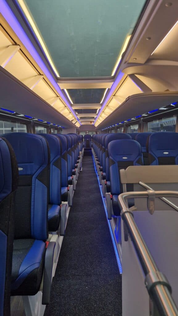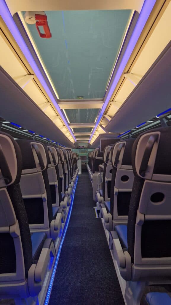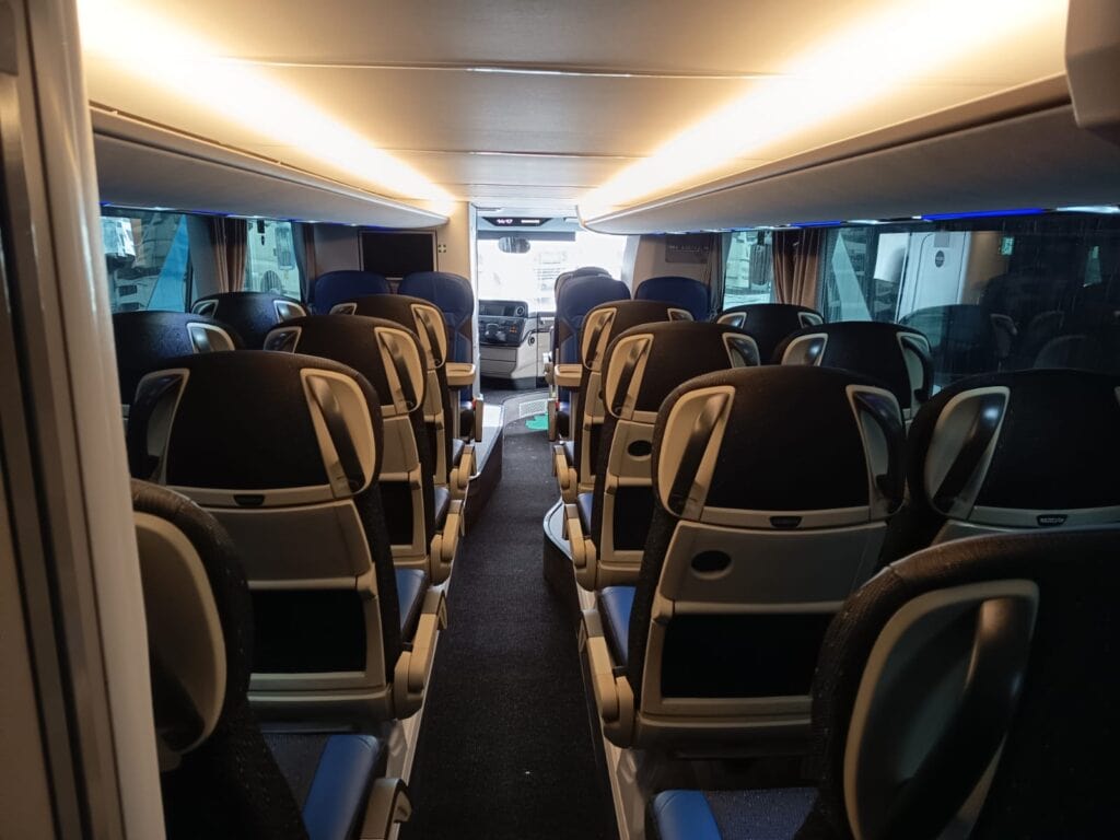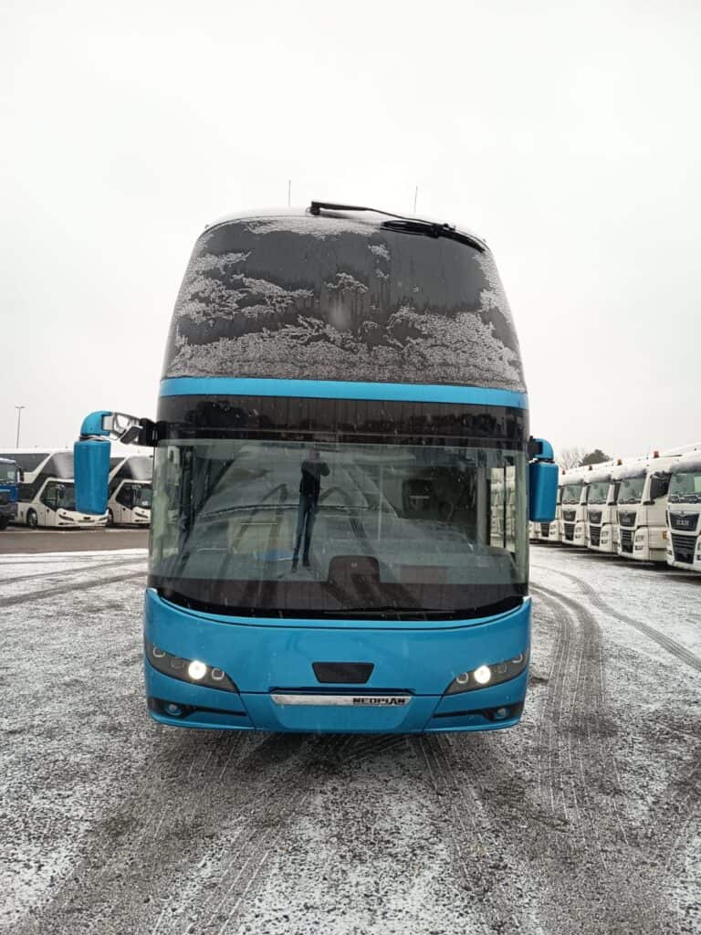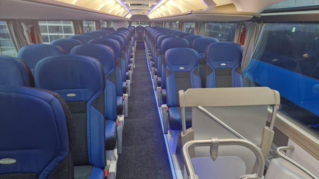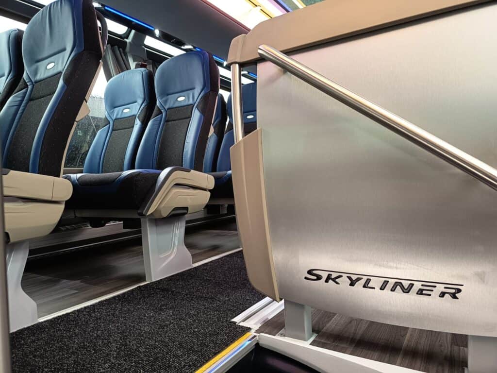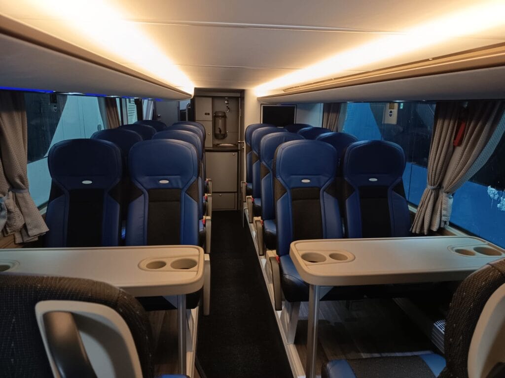 Unutrašnjost autobusa prati vanjski izgled gdje plavi tonovi dominiraju i čine jednu perfektnu vizuelnu cjelinu. Obje etaže su urađene u imitaciji drvenog poda, a krov je urađen u panoramskoj izvedbi koji će putnicima pružiti lijep pogled i dovoljno svjetlosti. Novi autobusi imaju ukupan kapacitet iznosi 83+1+1 sjedišta. Model i izvedba sjedišta su PremiumLine First i u plavo-crnoj izvedbi izgledaju zaista odlično. Sjedišta su u kombinaciji crne tkanine i plave kože, kao i na ranije isporučenim MAN autobusima, o čemu ste mogli čitati na našem portalu, sa sigurnosnim pojasevima u dvije tačke vezanja. Nezaobilazni logo Neoplan je ušiven na naslon svih sjedišta. Sva sjedišta imaju dvostruko bočno tapeciranje od kože što će poboljšati udobnost putnika posebno na dugim relacijama. Sjedišta su opremljena još sa preklopnim naslonima za ruke, preklopnim stolićima, mrežice za novine, osloncima za noge i naravno podesivim naslonima, gdje vrijedi istaći automatsko podešavanje sjedećeg dijela prilikom podešavanja naslona.