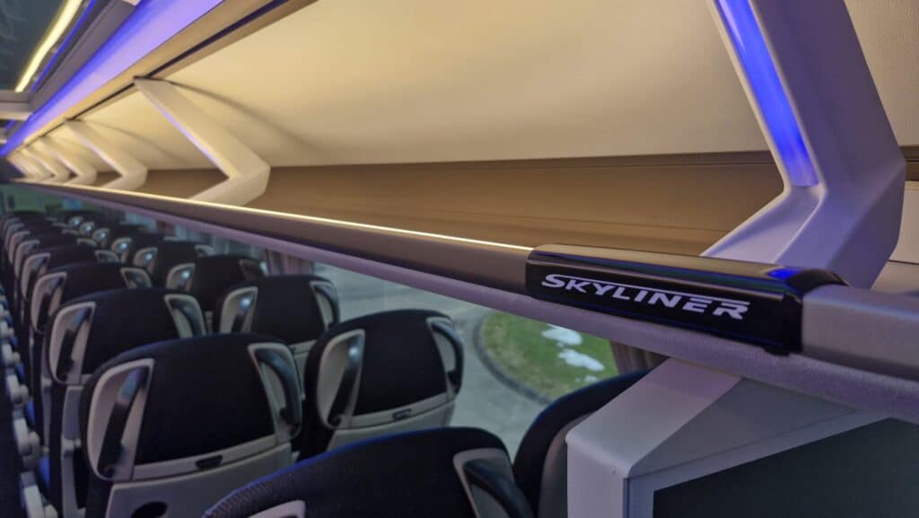 O vanjskom dizajnu se zaista nema šta raspravljati, pošto Neoplan standardno ima jedna od najljepših vozila na cesti. Vozilo ima kompletno LED rasvjetu kako s vana, tako i unutra. Zapremina rezervoara je 610 litara, dok je rezervoar za AdBlue tečnost kapaciteta 60 litara. S obzirom da se radi o dvospratnom vozilu sa dosta sjedišta i ograničenog prtljažnog kapaciteta, vozila su opremljena i sa nosačima za dodatne skiboksove po potrebi. Inače, ovi Skylineri imaju kapacitet od 11 m3 uključujući i police za ručnu prtljagu u unutrašnjosti.