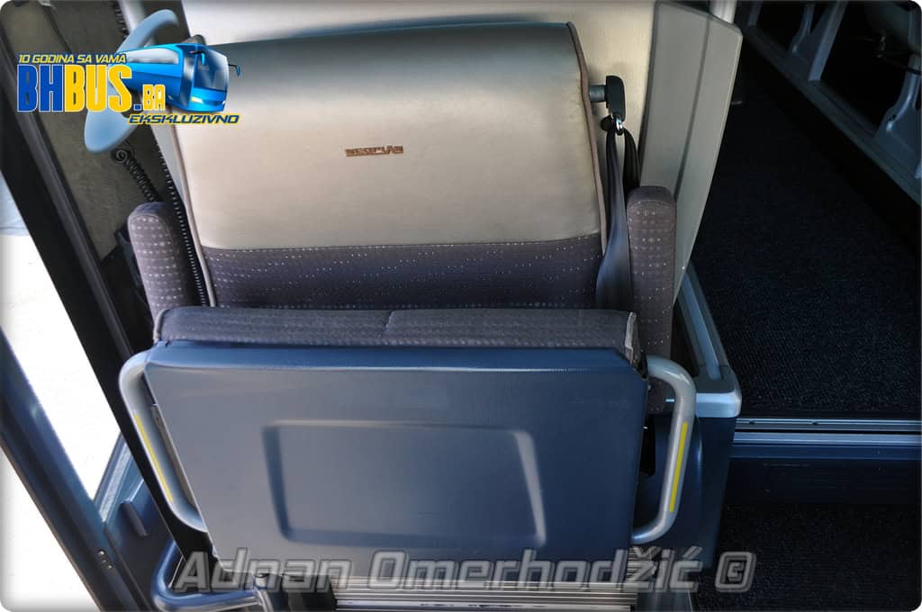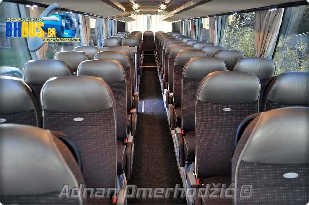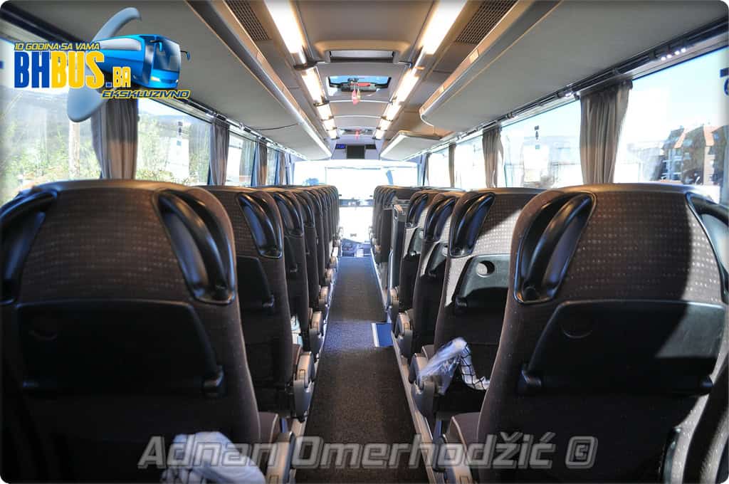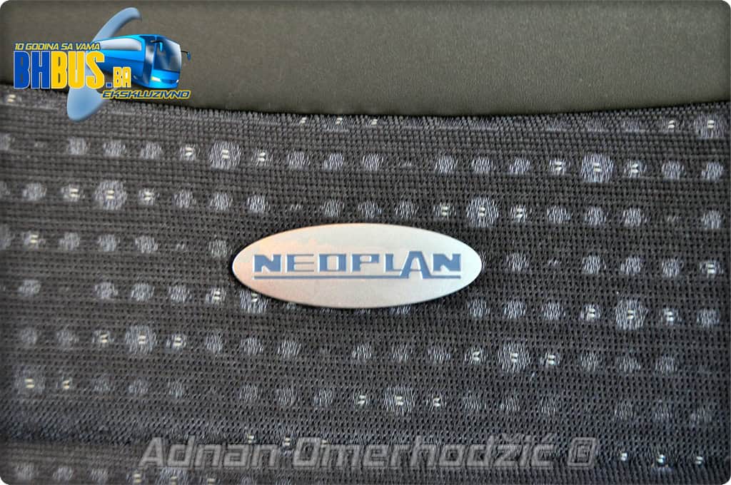 Raspored sjedišta je pefektan za ovu dužinu vozila i iznosi 49 mjesta za sjedenje što putnicima daje lagodan osjećaj pri putovanju. Sjedišta su turističkog tipa, proizvođača Kiel, u kombinaciji kože i tkanine. Sva sjedišta su opremljena sa naslonima za ruke i noge, opcijom obaranja naslonjača i izvlačenja prema hodniku te preklopnim stolićem i mrežicama za lične stvari. Još jedna stvar kojom su sva sjedišta opremljena je i ponosni logo Neoplan koji je zašiven u naslon sjedišta. Iznad svakog reda sjedišta nalazi se individualna klimatizacija, rasvjeta i zvučnici. Vozilo je opremljeno sa toaletom, dva frižidera – jedan u instrument tabli, drugi iznad toaleta te kuhinjom. Na usluzi će biti i Bosch audio/video sistem koji se sastoji od dva mikrofona i dva monitora. Jedan monitor se nalazi naprijed, dok se drugi nalazi centralno u hodniku i zanimljivo je da elektro pokretan što daje dodatnu dozu ekskluzivnosti ovom autobusu. Za ljepši i ugodniji ambijent prilikom vožnje pobrinut će se unutrašnja LED rasvjeta koja je napravljena u veoma ugodnom plavom svjetlu. Vozilo ima i utičnice od 220 V što će svakako dati dodatnu pogodnost putnicima na putovanjima, kao i pod u imitaciji parketa.