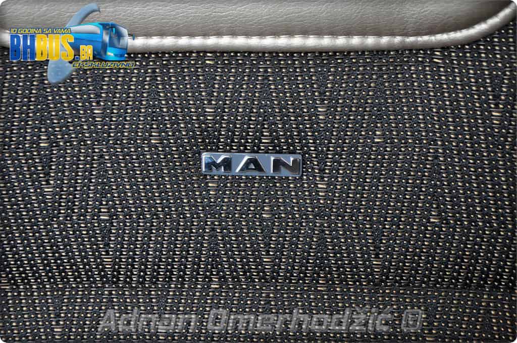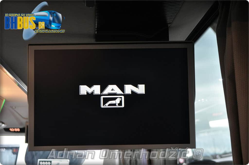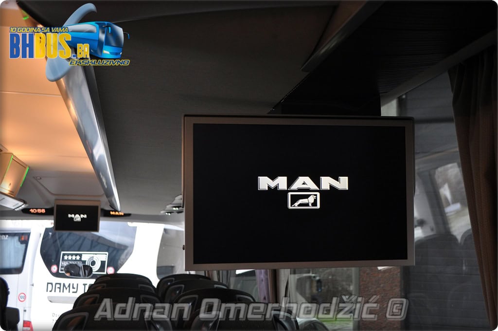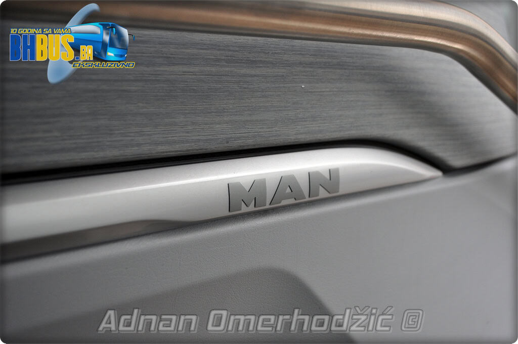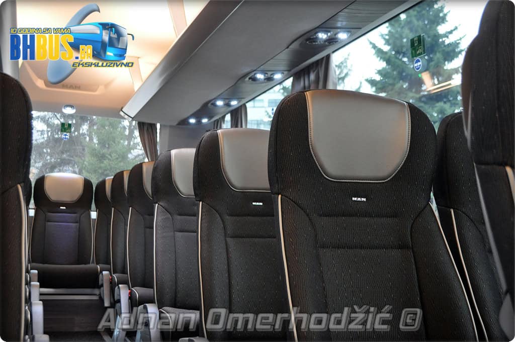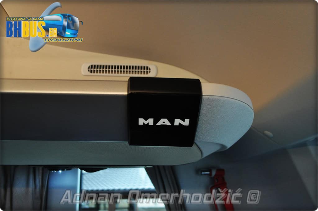 U unutrašnjost se, osim vozača i suvozača/vodiča, može smjestiti ukupno 49 putnika što je i maksimalan broj za ovaj tip autobusa. Sjedišta su proizvođača Kiel i to model ComfortLine BasicPlus u kombinaciji tkanine sa kožnim naslonima za glavu. Sjedišta su opremljena sa sigurnosnim pojasevima u dvije tačke vezanja, preklopnim stolićem, naslonom za ruke i naslonom za noge. Sjedišta do hodnika se mogu izvlačiti bočno čime se dobija dodatni komfor tokom putovanja, a sva sjedišta na naslonu imaju ušiven i MAN logo. Naravno, za dodatnu zabavu tokom putovanja, putnicima će na raspolaganju biti i audio/video oprema sa dva LCD monitora i standardni MMC – Multi Media Coach Advanced sistem. Od ostale opreme možemo spomenuti LED unutrašnju rasvjetu, pod u imitaciji parketa, klimatiziranu kabinu za odmor vozača kod drugih vrata, toalet sa senzorom dima, mikrofoni, frižider u prednjem dijelu vozila te sisteme klimatizacije i grijanja. Neizostavni dio opreme je i inverter sa nekoliko 230 V utičnica te USB prikljčci.