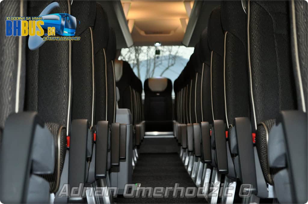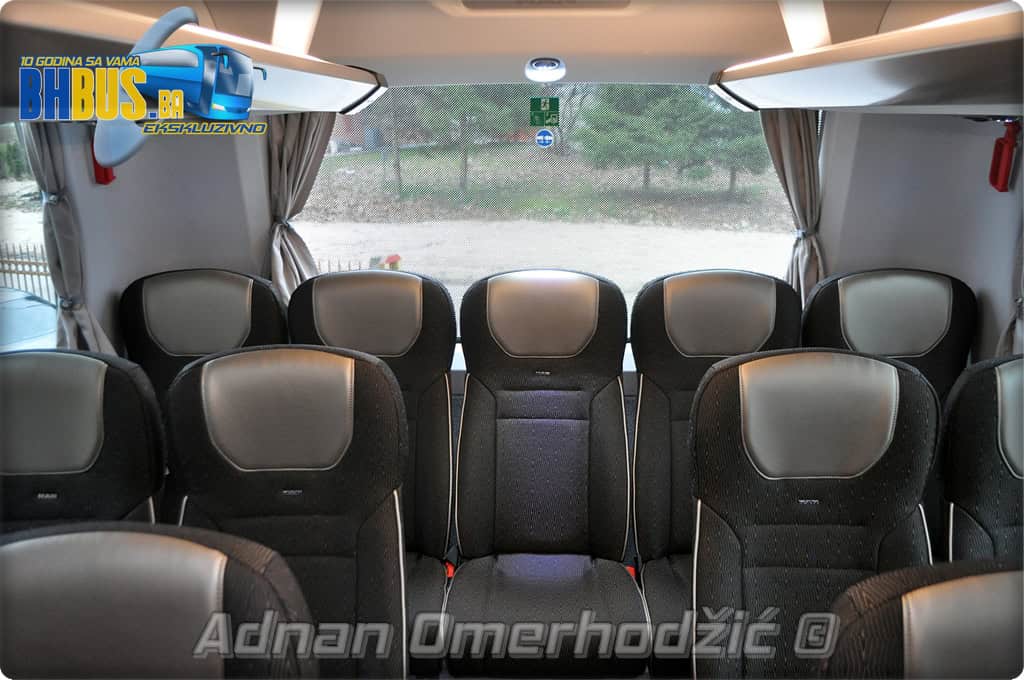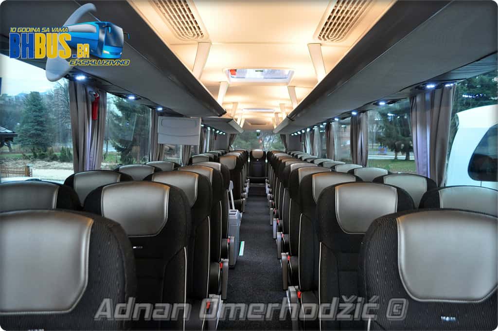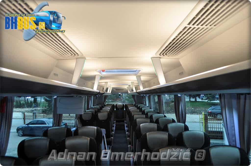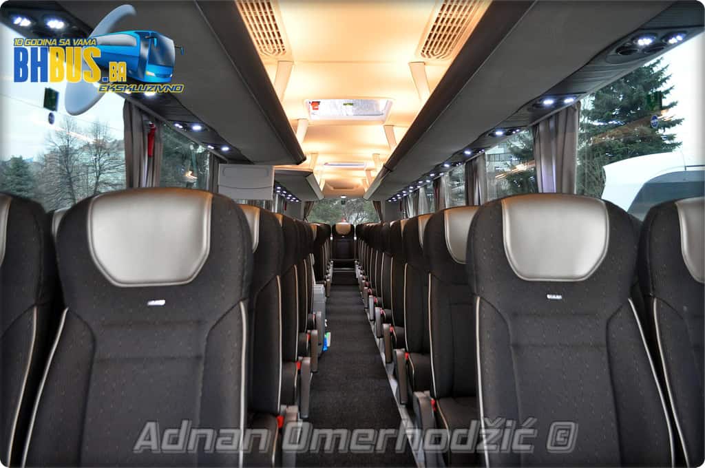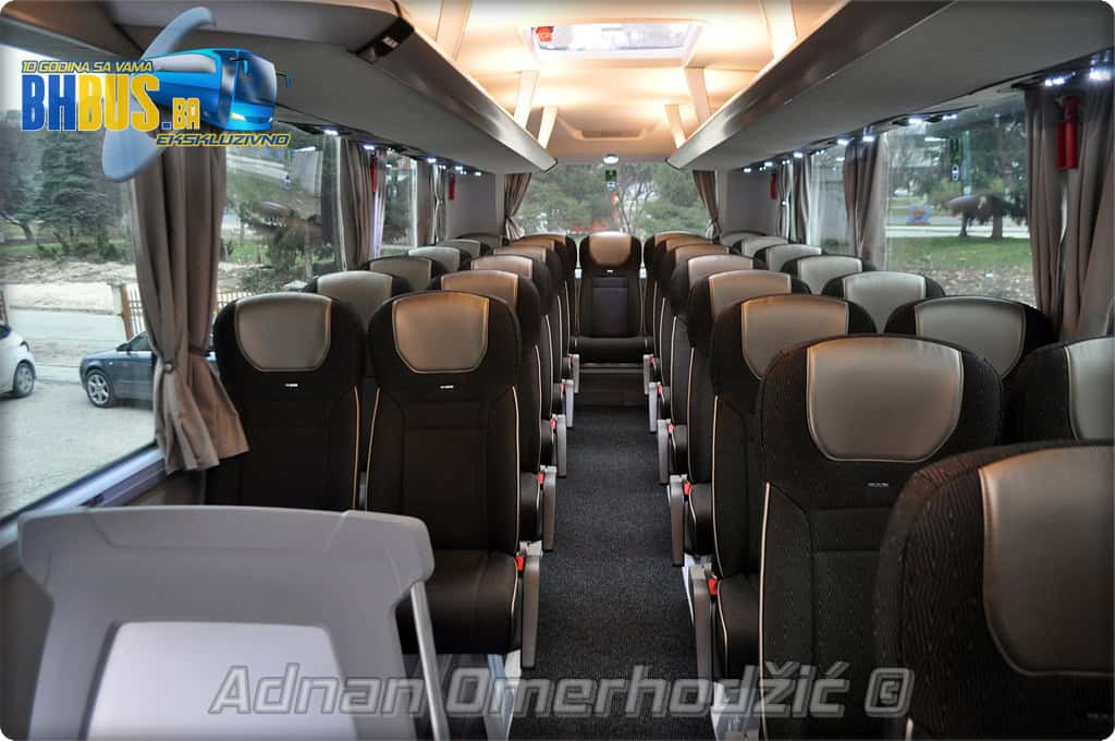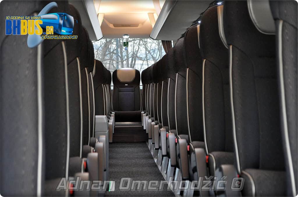 U unutrašnjost se, osim vozača i suvozača/vodiča, može smjestiti ukupno 49 putnika što je i maksimalan broj za ovaj tip autobusa. Sjedišta su proizvođača Kiel i to model ComfortLine BasicPlus u kombinaciji tkanine sa kožnim naslonima za glavu. Sjedišta su opremljena sa sigurnosnim pojasevima u dvije tačke vezanja, preklopnim stolićem, naslonom za ruke i naslonom za noge. Sjedišta do hodnika se mogu izvlačiti bočno čime se dobija dodatni komfor tokom putovanja, a sva sjedišta na naslonu imaju ušiven i MAN logo. Naravno, za dodatnu zabavu tokom putovanja, putnicima će na raspolaganju biti i audio/video oprema sa dva LCD monitora i standardni MMC – Multi Media Coach Advanced sistem. Od ostale opreme možemo spomenuti LED unutrašnju rasvjetu, pod u imitaciji parketa, klimatiziranu kabinu za odmor vozača kod drugih vrata, toalet sa senzorom dima, mikrofoni, frižider u prednjem dijelu vozila te sisteme klimatizacije i grijanja. Neizostavni dio opreme je i inverter sa nekoliko 230 V utičnica te USB prikljčci.