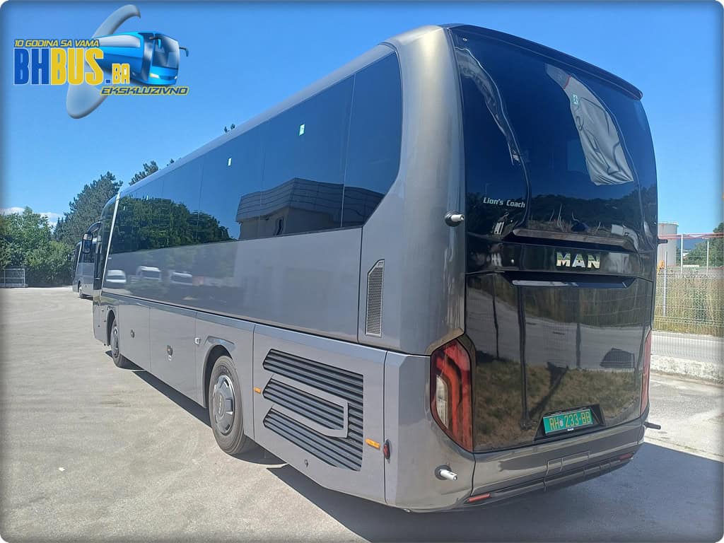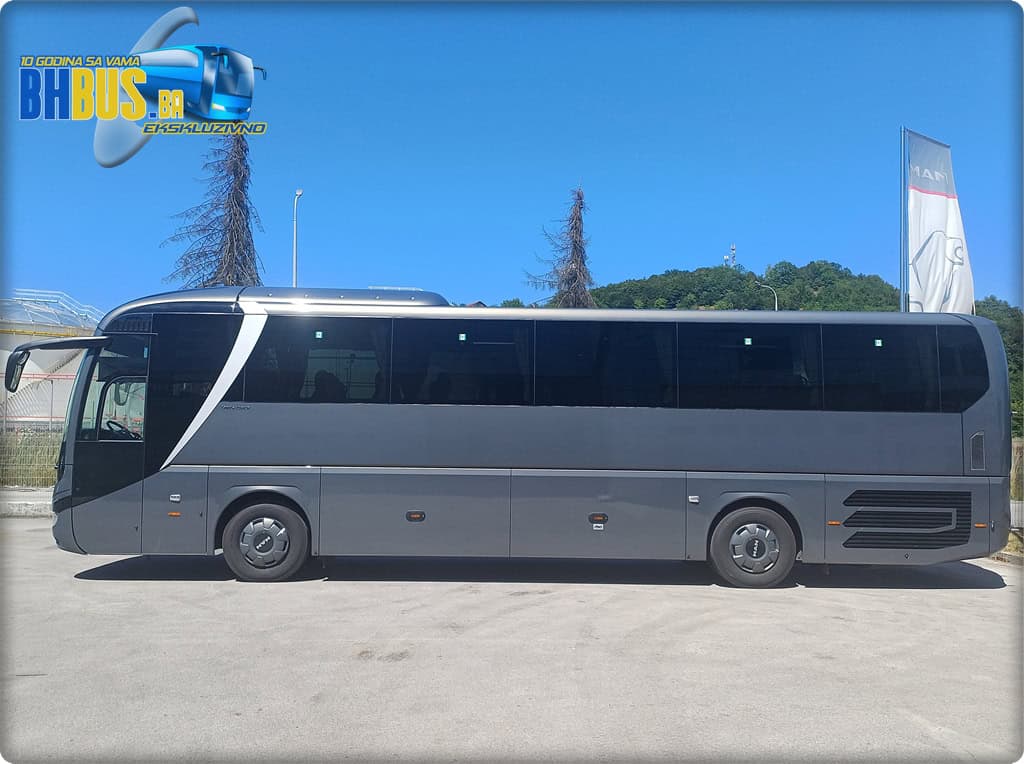 Kada govorimo o vanjskom izgledu, nova generacija Lion's Coach autobusa je sada već dobro poznata na našim cestama. Ipak, vrijedi istaći da su prednja i zadnja strana urađena u kombinaciji stakla i plastike, a atraktivnom izgledu doprinosi i vanjska LED rasvjeta (glavna svjetla, dnevna svjetla i žmigavci). Poklopci bunkera se otvaraju paralelno, a vjetrobransko staklo je grijano i tonirano u blagu zelenu nijansu. Bočna stakla su dvostruka i totalno su zatamnjena. Vanjski retrovizori su također grijani i elektronski su podesivi. Autobus je isporučen u istoj boji kao i prošlogodišnji MAN Lion's Coach R08 – Metalik Texas Grey boji, koja je bila hit prošle godine, a izgleda da se taj trend zadrava i ove. Vozilo je opremljeno i MAN sa ratkapama nove generacije, u boji vozila, kao i nosačima za skibox, u slučaju da ukupan kapacitet prtljage od 10 m3 ne bude dovoljan.