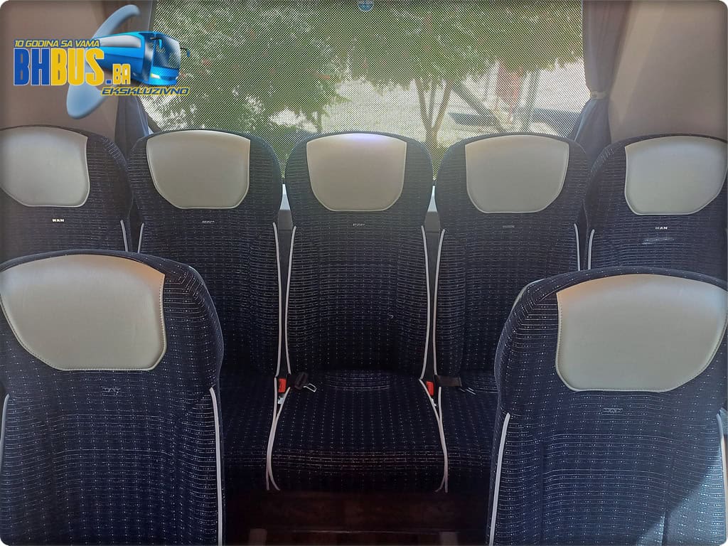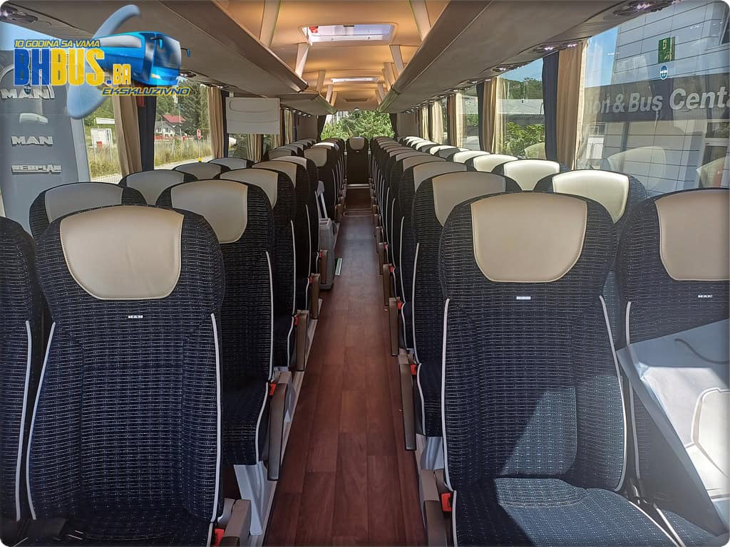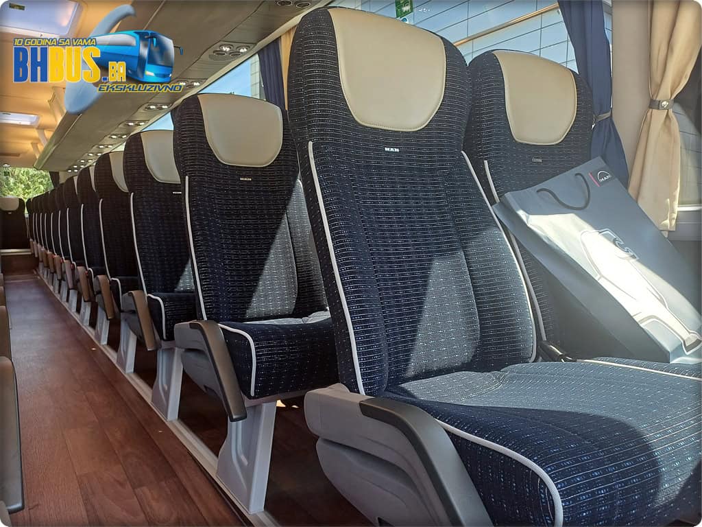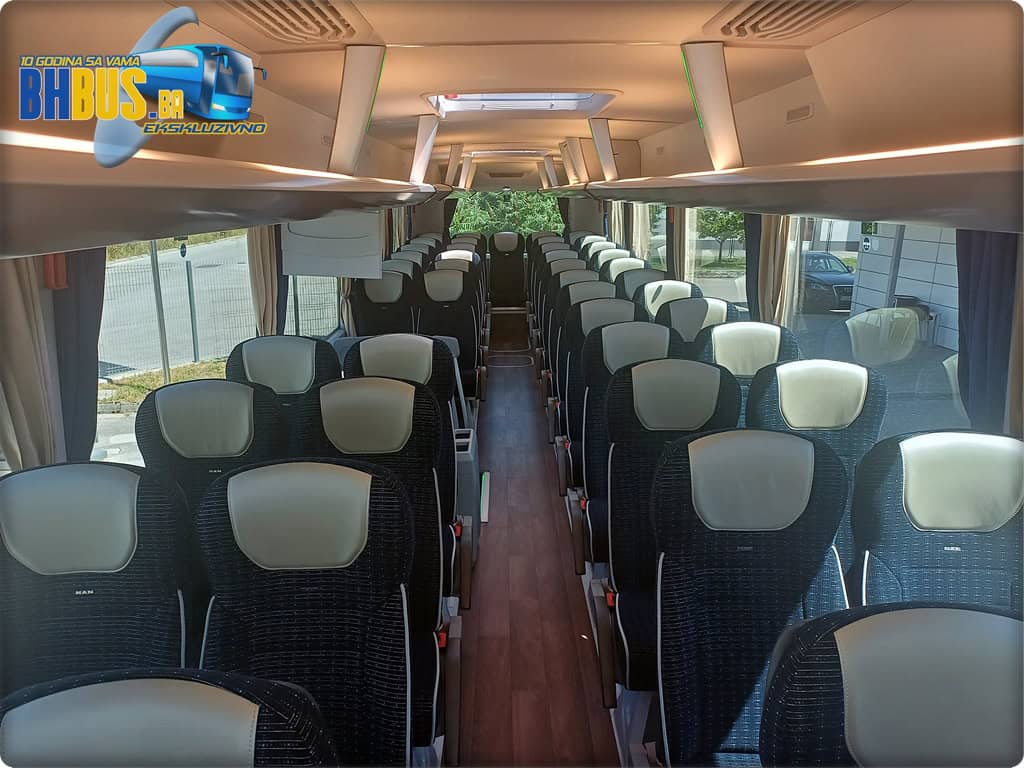 Ukupan kapacitet vozila je 49+1+1 sjedećih mjesta. Kao i na prethodno isporučenim MAN autobusima, sjedišta su proizvođača Kiel, model ComfortLine BasicPlus, urađena u kombinaciji tkanine i kožnog naslona za glavu. Značajke kao obaranje naslona, stolići, mrežice za lične stvari, naslonjači za noge, sigurnosni pojasevi i oslonci za ruke su dio standarda koji će putnicima osigurati da svako putovanje bude udobno. Dodatni MAN štih daje i stilizirani amblem na svakom sjedištu. Pod je urađen u imitaciji drveta, a WC je ugrađen ispred zadnjih vrata sa opcijom zaključavanja sa vozačkog mjesta i sa senzorom dima.