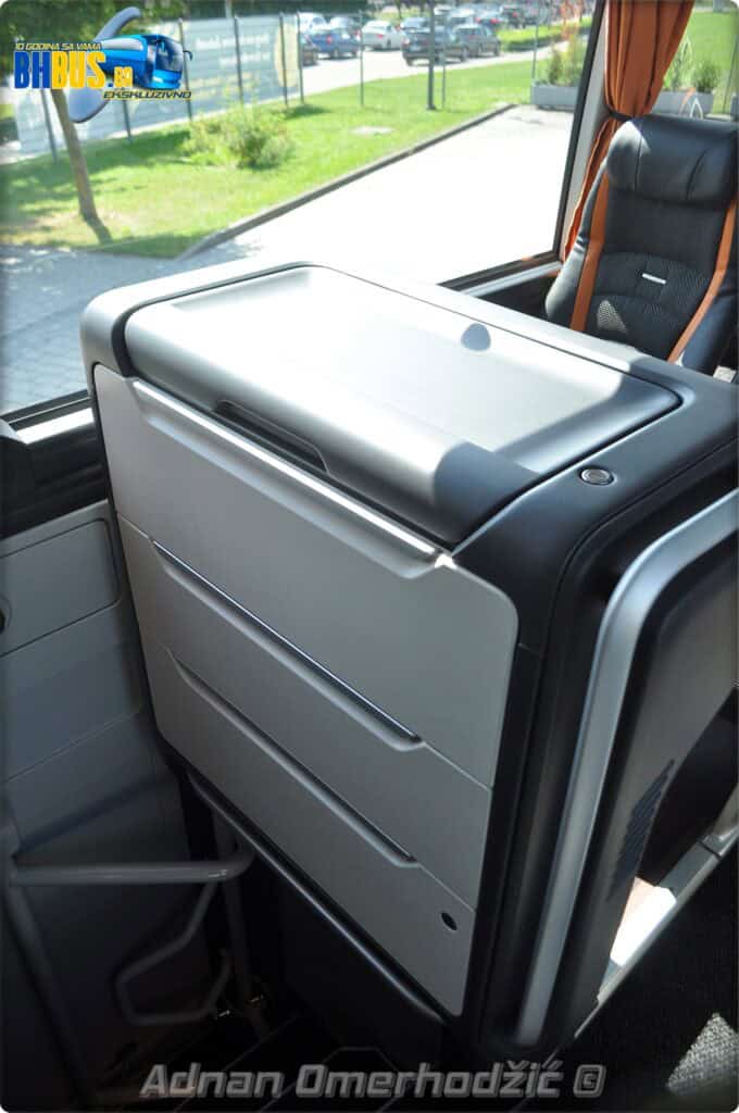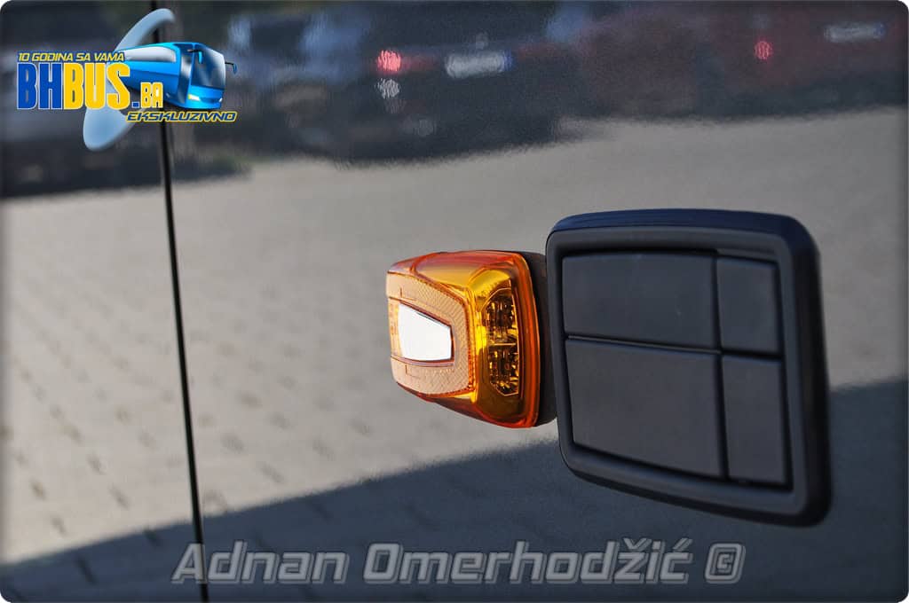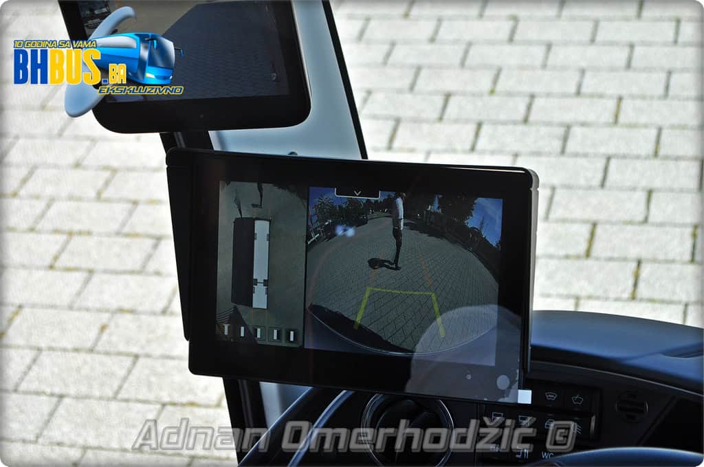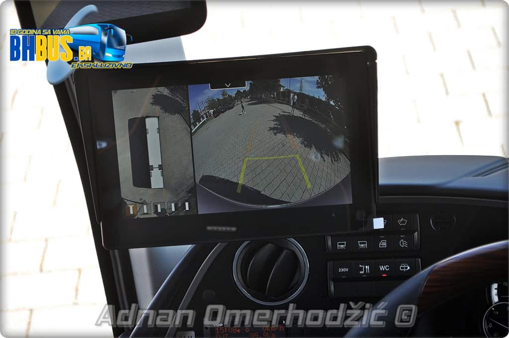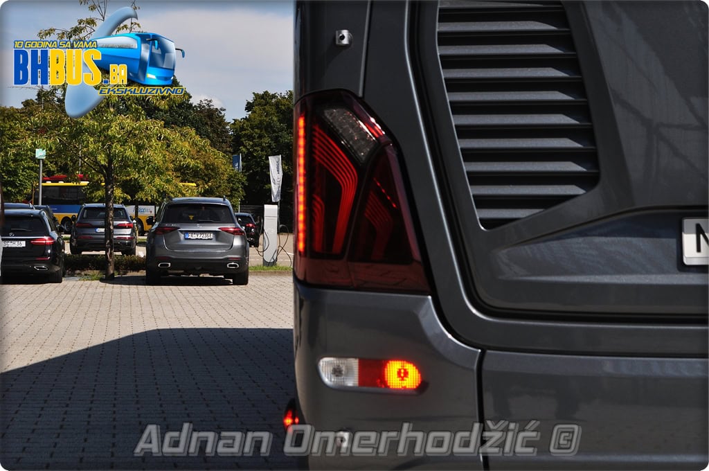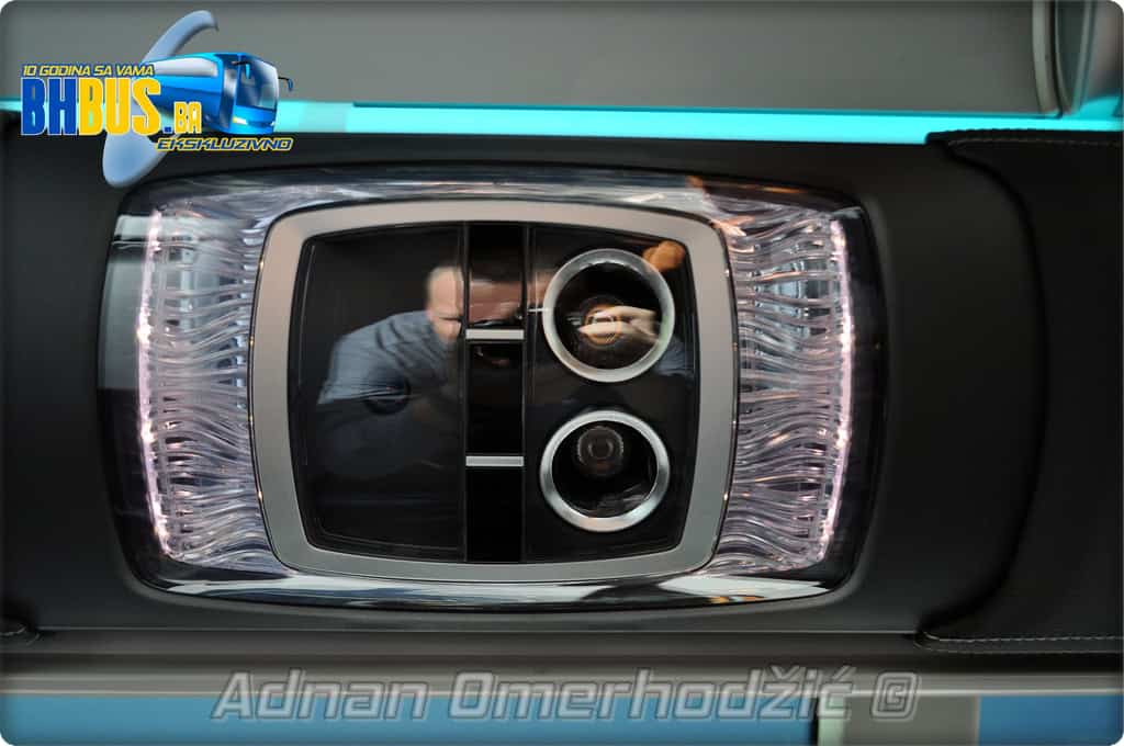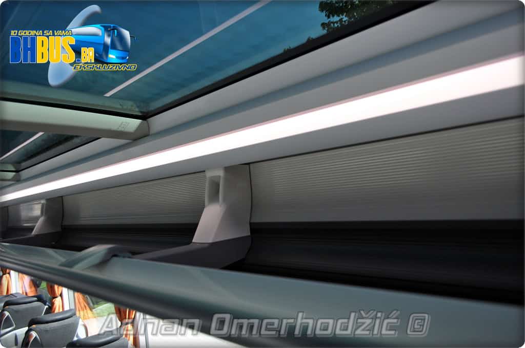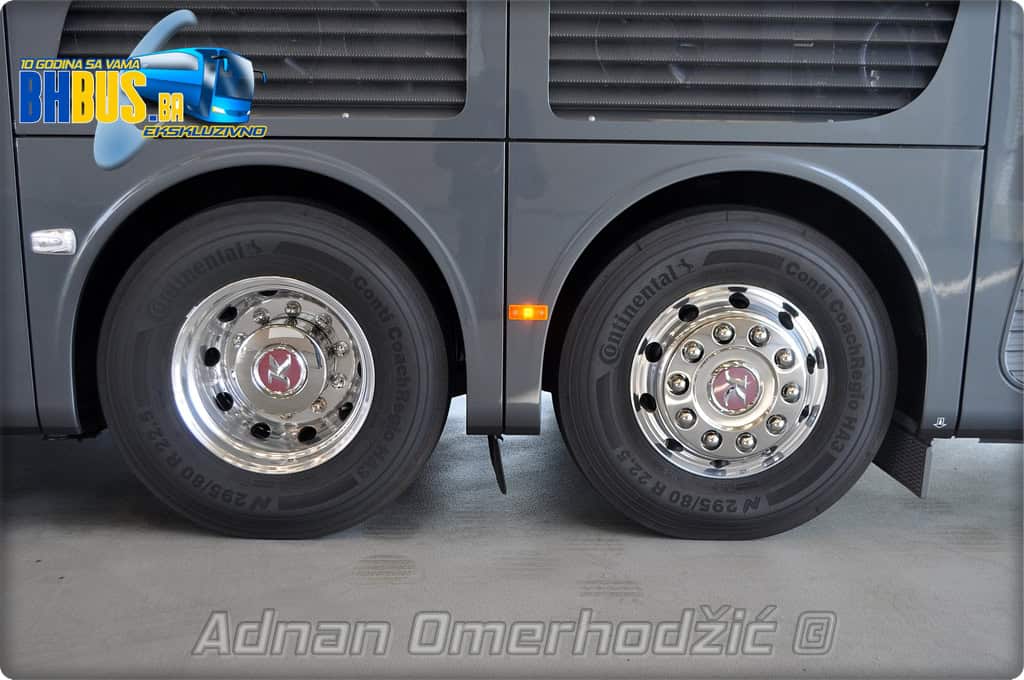 Ono što je još uočljivo na prvu je i nedostatak klasičnih retrovizora koji su zamjenjeni sistemom kamera. Vanjski izgled dodatno uljepšavaju i aluminijumske felge visokog sjaja na kojim se nalaze Continental gume u dimenziji 295/80 R22,5. Ukupni kapacitet rezervoara za dizel iznosi čak 830 litara! Veliki autobus sa sobom donosi i veliki prtljažni kapacitet. Osim stadnardnog prostora za prtljag u unutrašnjosti i između osovina, prostor za prtljag se nalazi i iznad prve osovine sa obje strane, čineći ukupan kapacitet prtljaga fantastičnih 13,9 m3. Za svaki slučaj, pozadi se nalaze i nosači za skibox, za koji vjerujemo neće biti potrebe. Prtljažni poklopci su sa paralelnim otvaranjem, a prtljažni prostor je osvjetljen. Sva rasvjeta na vozilu je u LED izvedbi uključujući i bočna gabaritna svjetla, dodatnu krovnu rasvjetu i krovno osvjetljenje na kraju vozila sa obje strane.