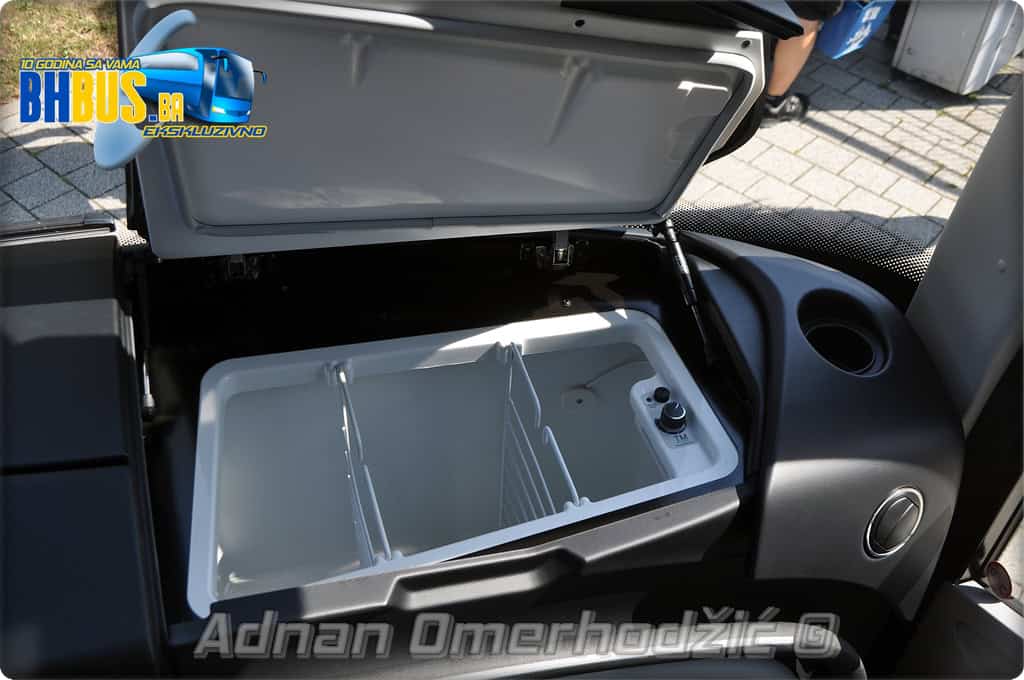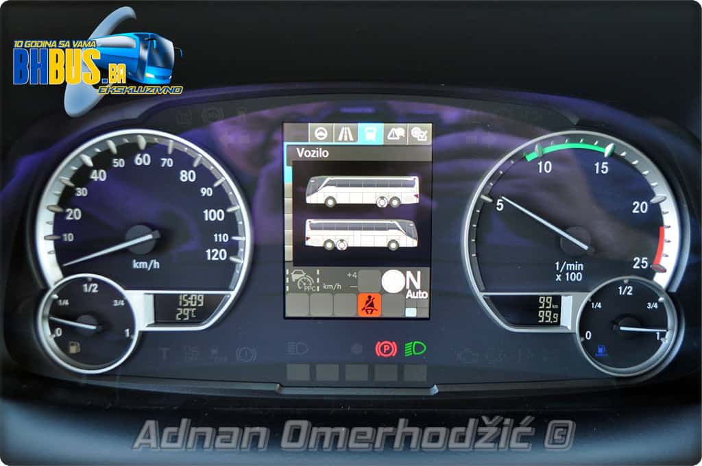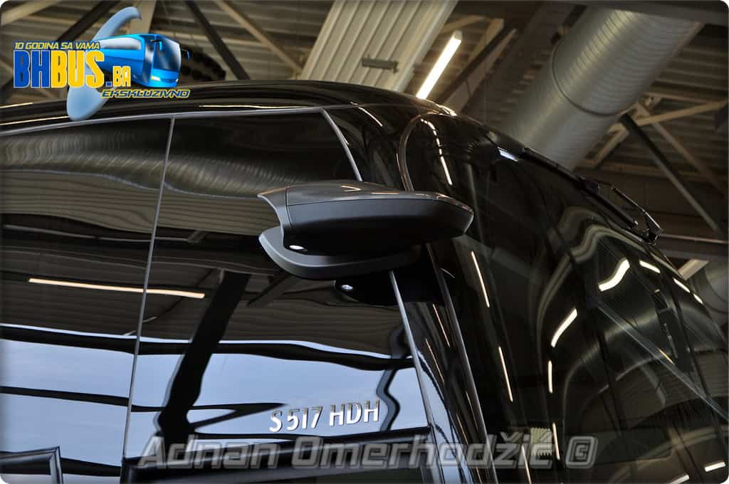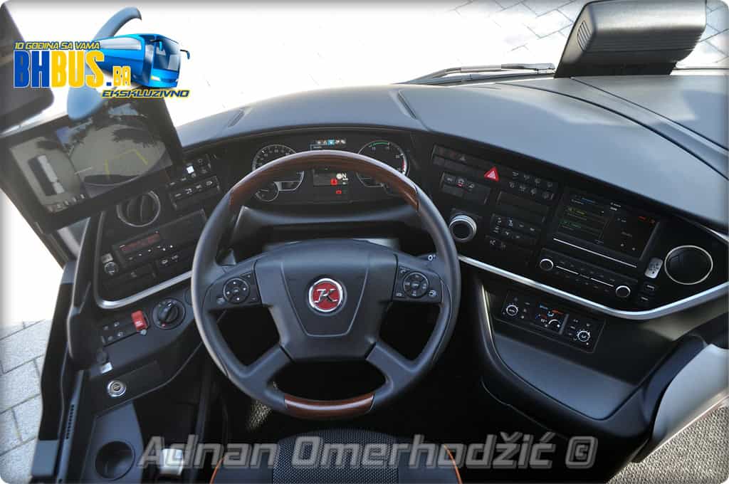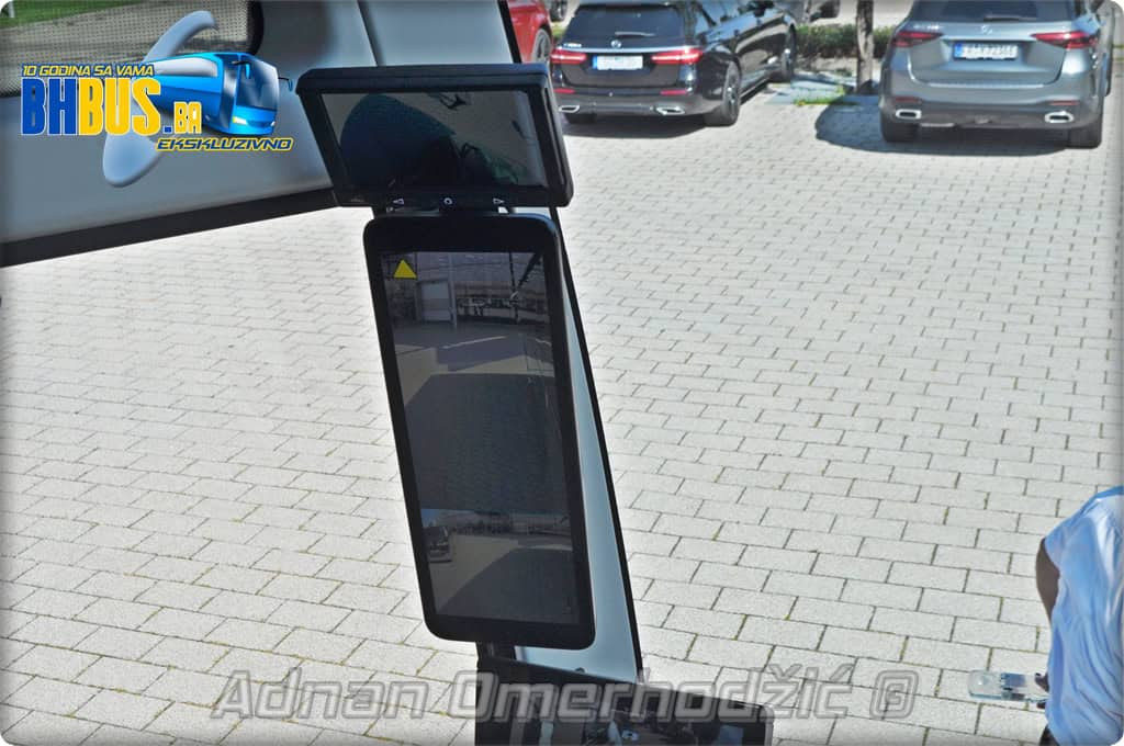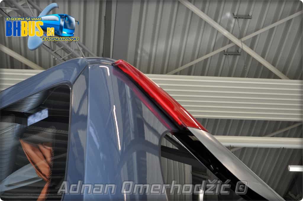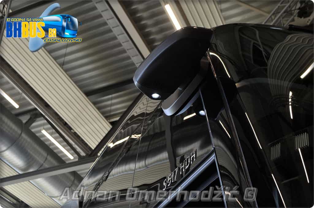 Ono što je još uočljivo na prvu je i nedostatak klasičnih retrovizora koji su zamjenjeni sistemom kamera. Vanjski izgled dodatno uljepšavaju i aluminijumske felge visokog sjaja na kojim se nalaze Continental gume u dimenziji 295/80 R22,5. Ukupni kapacitet rezervoara za dizel iznosi čak 830 litara! Veliki autobus sa sobom donosi i veliki prtljažni kapacitet. Osim stadnardnog prostora za prtljag u unutrašnjosti i između osovina, prostor za prtljag se nalazi i iznad prve osovine sa obje strane, čineći ukupan kapacitet prtljaga fantastičnih 13,9 m3. Za svaki slučaj, pozadi se nalaze i nosači za skibox, za koji vjerujemo neće biti potrebe. Prtljažni poklopci su sa paralelnim otvaranjem, a prtljažni prostor je osvjetljen. Sva rasvjeta na vozilu je u LED izvedbi uključujući i bočna gabaritna svjetla, dodatnu krovnu rasvjetu i krovno osvjetljenje na kraju vozila sa obje strane.