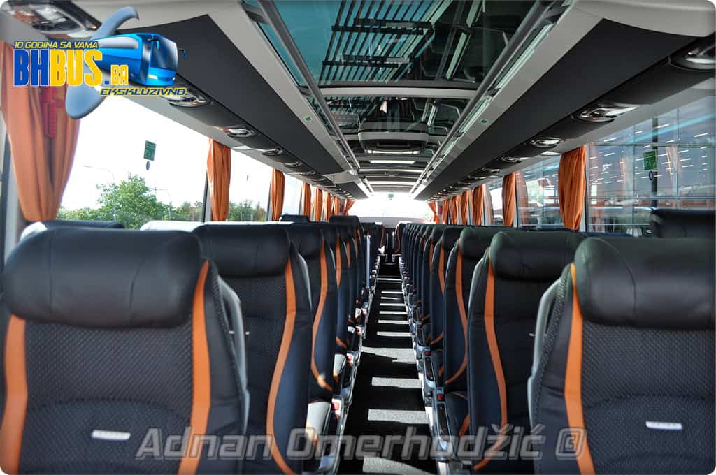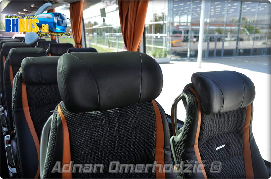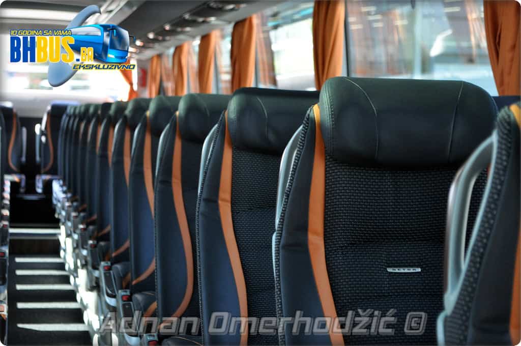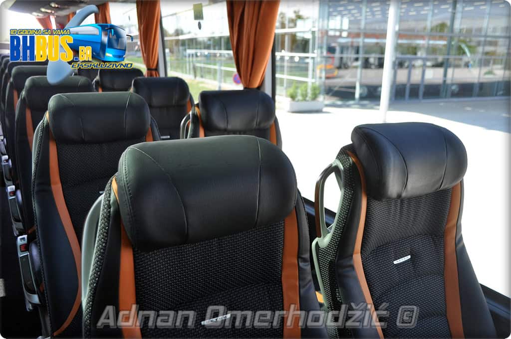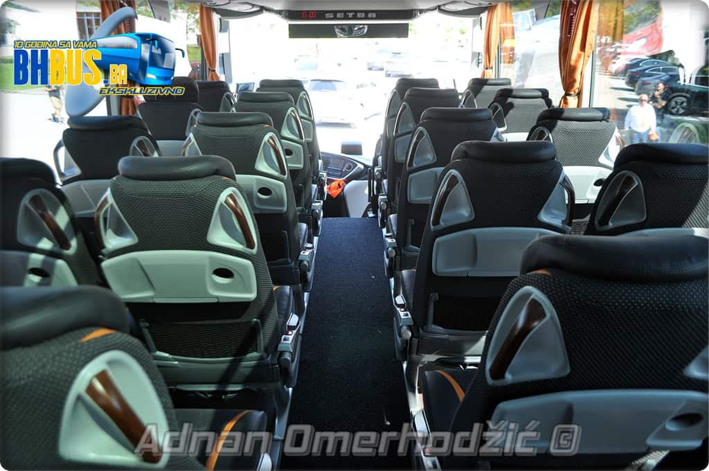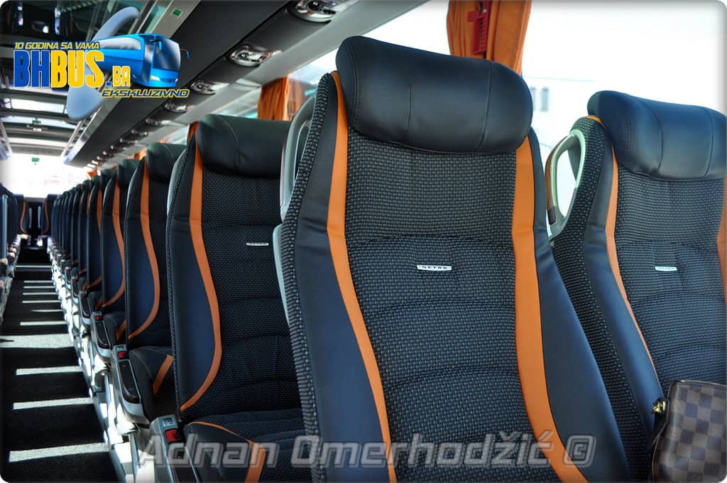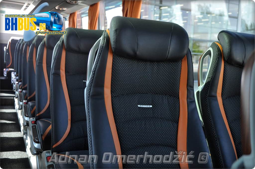 Ukupni kapacitet vozila je 58+2+1 sjedišta. Putnička sjedišta su Setra Voyage Ambassador prilagođena bojama kompanije i u kombinaciji kože i tkanine. Na sredini naslona se nalazi Setra logo, a kožni naslon za glavu je jako komforan i podesiv – na izvlačenje. Sjedišta su opremljena svim značajkama da pruže komfornu vožnju bez obzira na dužinu relacije. Iznad sjedišta se nalazi servisni set sa svjetlom i puhaljkama za zrak. Svjetla za čitanje su također u LED izvedbi, a luskuz se ogleda i u dekorativnim elementima između servisnih setova koji su u imitaciji kože i sa ukrasnim šavom. Kada smo spomenuli rasvjetu, vrijedi istaći da je ambijentalno osvjetljenje također u LED tehnologiji i u 12 dostupnih boja.