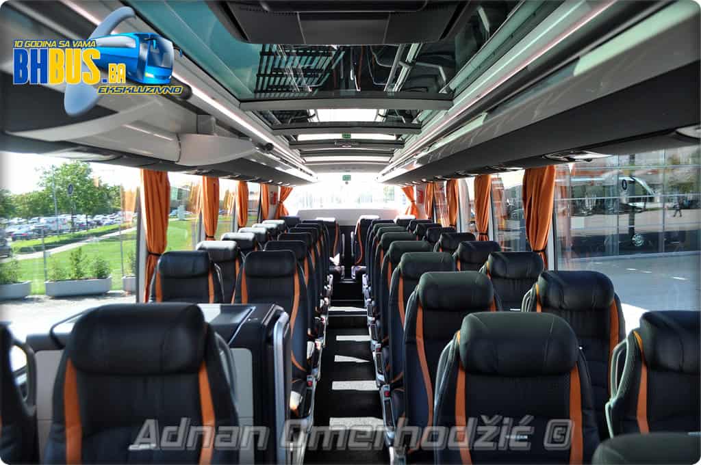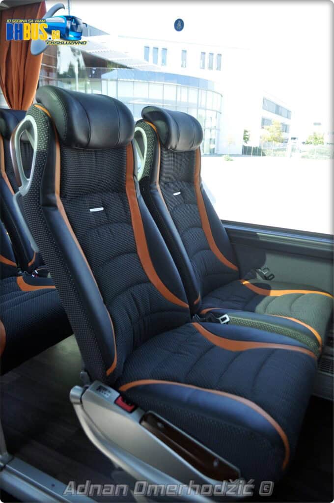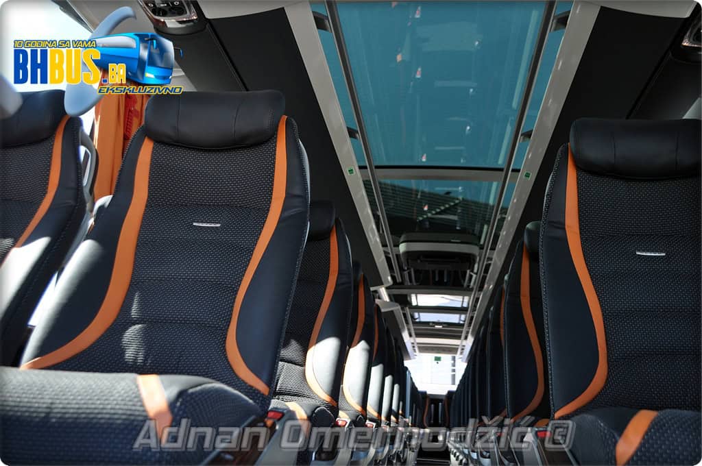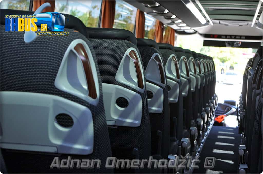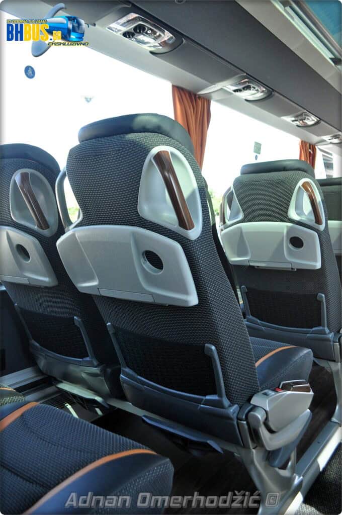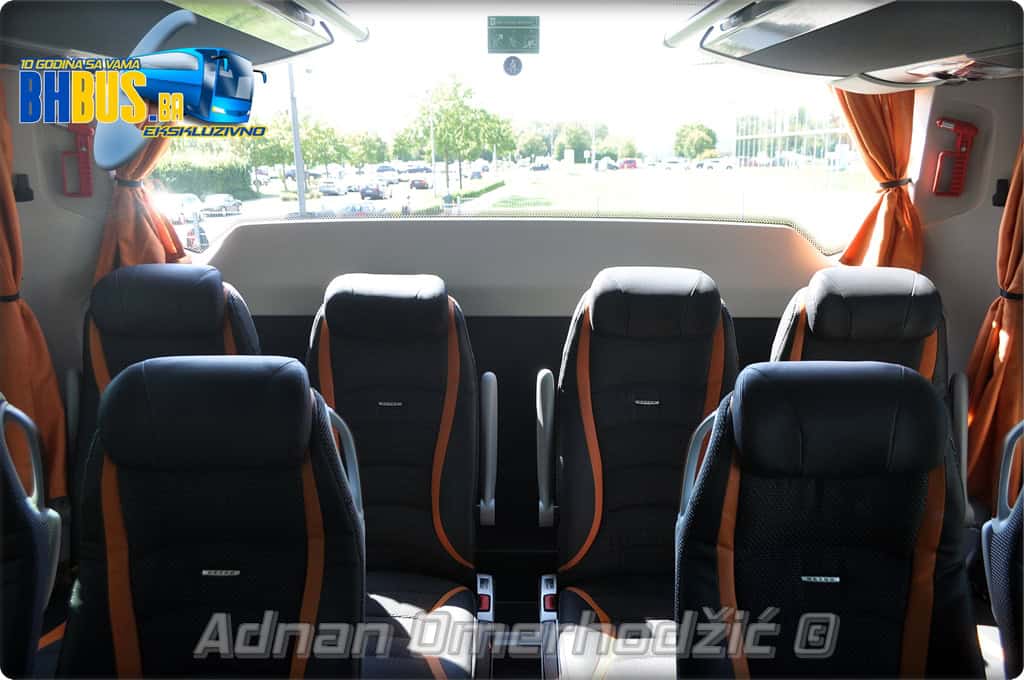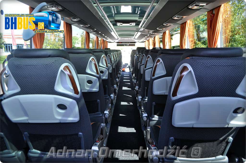 Ukupni kapacitet vozila je 58+2+1 sjedišta. Putnička sjedišta su Setra Voyage Ambassador prilagođena bojama kompanije i u kombinaciji kože i tkanine. Na sredini naslona se nalazi Setra logo, a kožni naslon za glavu je jako komforan i podesiv – na izvlačenje. Sjedišta su opremljena svim značajkama da pruže komfornu vožnju bez obzira na dužinu relacije. Iznad sjedišta se nalazi servisni set sa svjetlom i puhaljkama za zrak. Svjetla za čitanje su također u LED izvedbi, a luskuz se ogleda i u dekorativnim elementima između servisnih setova koji su u imitaciji kože i sa ukrasnim šavom. Kada smo spomenuli rasvjetu, vrijedi istaći da je ambijentalno osvjetljenje također u LED tehnologiji i u 12 dostupnih boja.