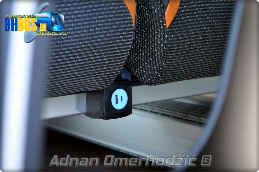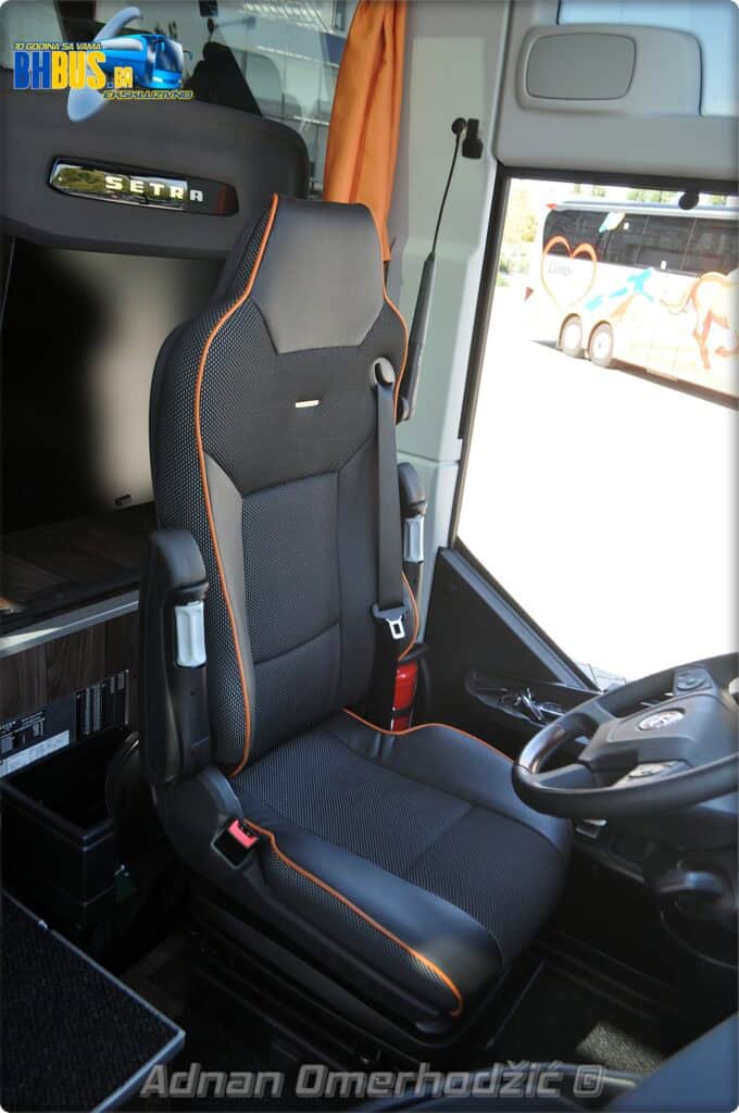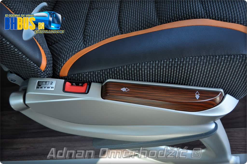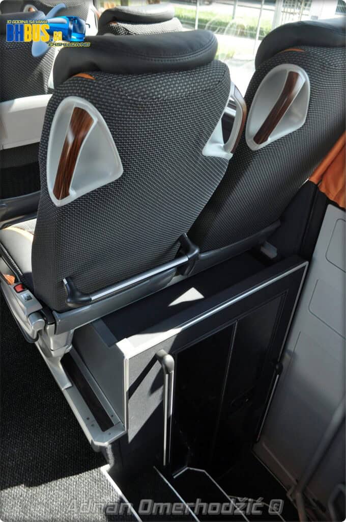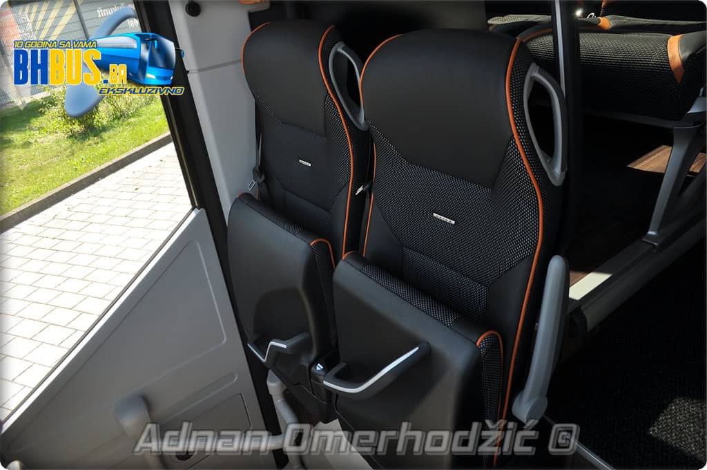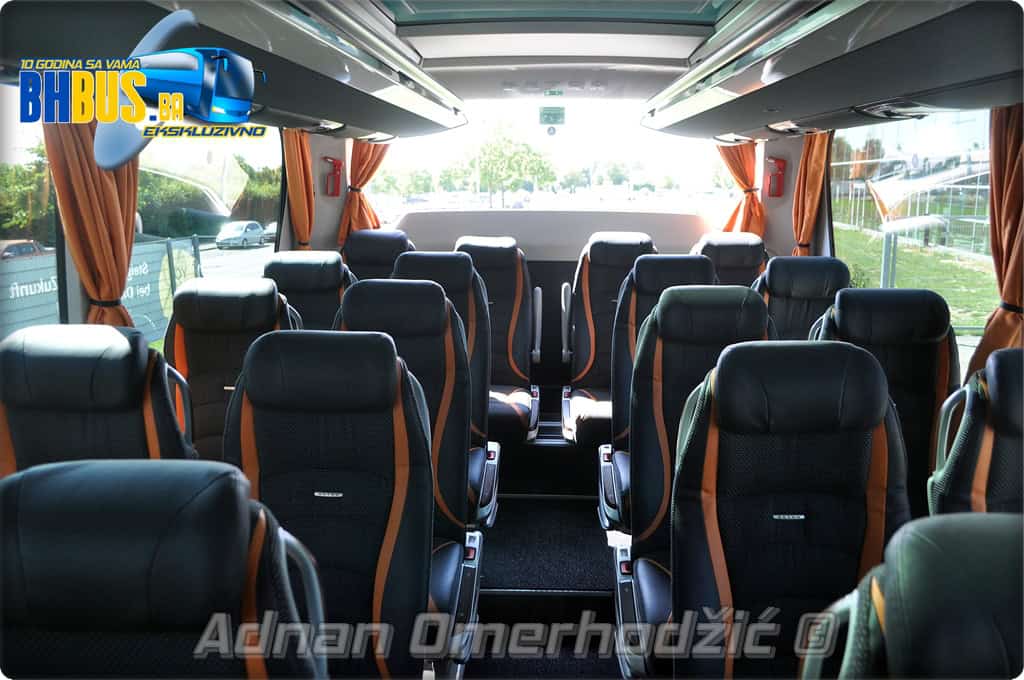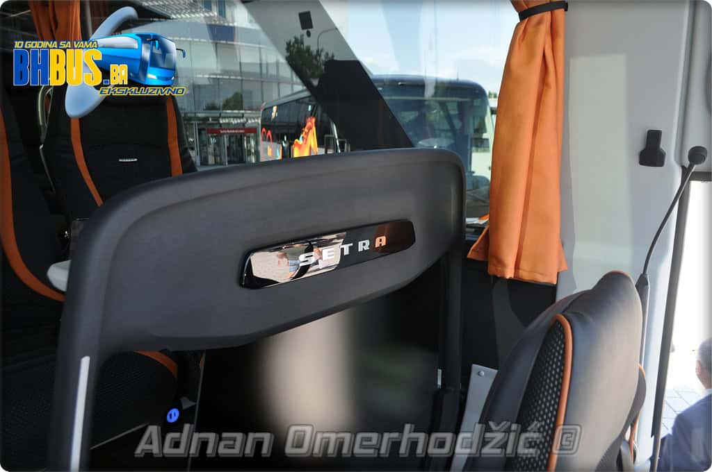 Ukupni kapacitet vozila je 58+2+1 sjedišta. Putnička sjedišta su Setra Voyage Ambassador prilagođena bojama kompanije i u kombinaciji kože i tkanine. Na sredini naslona se nalazi Setra logo, a kožni naslon za glavu je jako komforan i podesiv – na izvlačenje. Sjedišta su opremljena svim značajkama da pruže komfornu vožnju bez obzira na dužinu relacije. Iznad sjedišta se nalazi servisni set sa svjetlom i puhaljkama za zrak. Svjetla za čitanje su također u LED izvedbi, a luskuz se ogleda i u dekorativnim elementima između servisnih setova koji su u imitaciji kože i sa ukrasnim šavom. Kada smo spomenuli rasvjetu, vrijedi istaći da je ambijentalno osvjetljenje također u LED tehnologiji i u 12 dostupnih boja.
