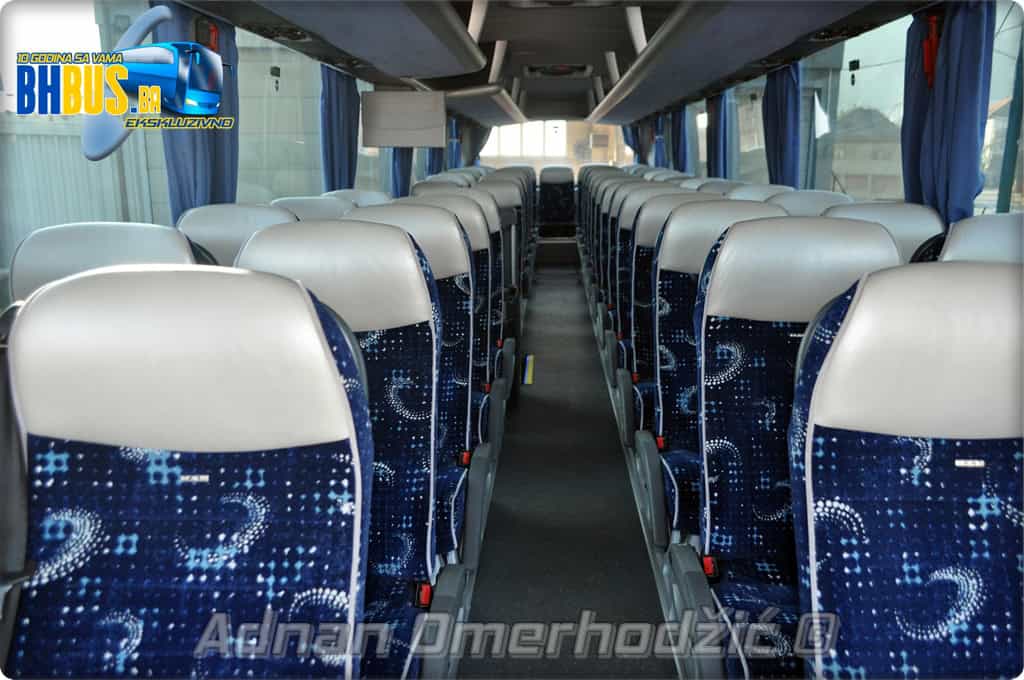 Unutrašnjost može da primi 49 putnika, a model sjedišta je također luksuzniji od standardnih sjedišta koja su se ugrađivala u ovaj model Lion's Coacha. Sjedišta su u kombinaciji plave tkanine i bež kože sa MAN amblemom na naslonjačima. Sjedišta su pomična sa obaranjem naslonjača, a svako sjedište ima sigurnosni pojas, stolić na preklop, mrežicu za stvari te naslone za ruke i noge. Pogled na sjedišta otkriva i koliko dobro je vozilo očuvano. Unutrašnju skladnost zaokružuju plave zavjese i plave police za prtljag.