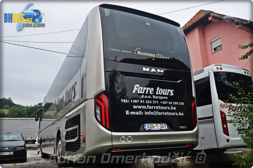 Isporučeni MAN je 2019. godina i u novi dom je stigao sa samo 18.000 kilometara na satu. Trenutno je nešto ispod 27.000 km, što svjedoči o količini posla u kompaniji Farre tours te kako je stigao u pravi čas. Pogoni ga domaći MAN Euro 6 agregat snage 460 KS koji će, u kombinaciji sa automatskim mjenjačem, u svakom trenutku osigurati tihu, glatku i nadasve ekonomičnu vožnju. Osim novih ekonomskih prednosti, nova generacija Lion's Coach autobusa je i sigurnija nego ikad prije. Tome svjedoče sistemi kao što su EBS sa ASR, ABS i ESP sistemi, LGS sistem te EBA sistem uz nezaobilazni ZF intarder te kameru za vožnju unazad. Vozaču će biti na raspolaganju udobno i prilagodljivo ISRI sjedište sa mikrofonom, a svoju primjenu će, uz multifunkcionalni volan, naći i fabrička navigacija. Kako bi se kvalitetno odmorili tokom putovanja, vozači će na raspolaganju imati i spavaću kabinu kod drugih vrata.