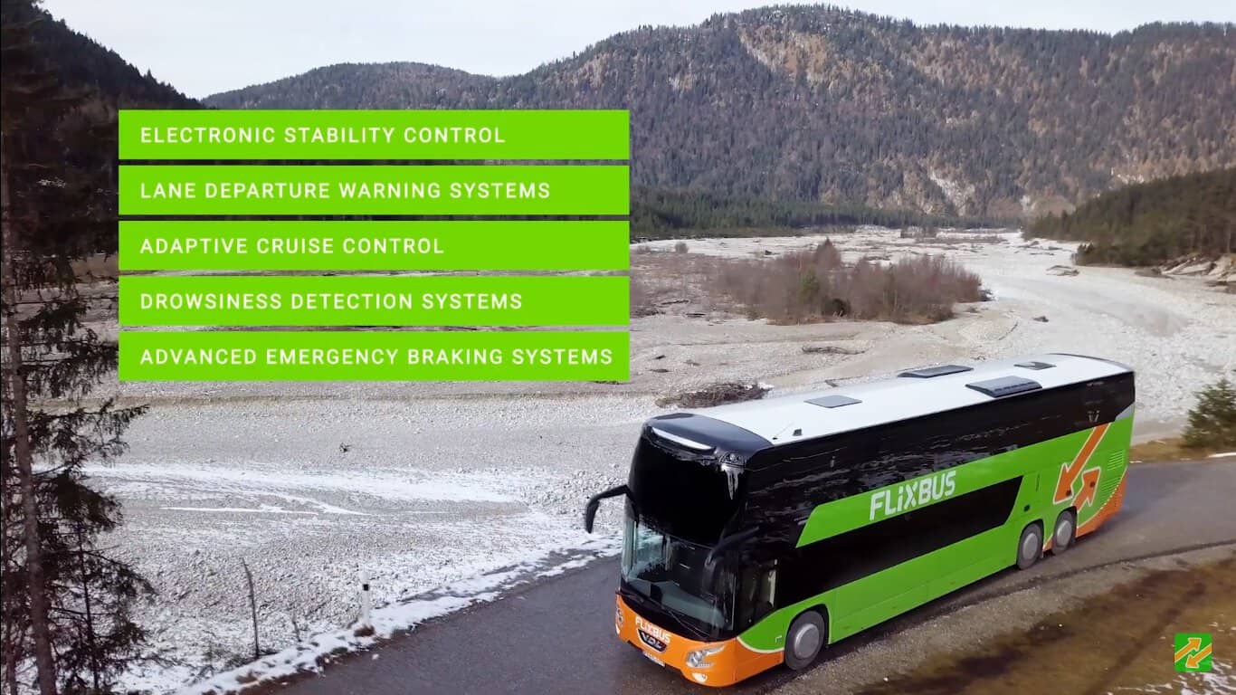 FlixBus flota autobusa širom Evrope prelazi osnovne mjere sigurnosti kroz opremu najviših sigurnosnih standarda poput elektronske kontrole stabilnosti, sistema koji upozorava prelazak trake, prilagodljivog tempomata, sistema za prepoznavanje umora vozača te sistema za kočenje u nuždi kao i aktivna pomoć pri kočenju. Naša flota redovito se održava i oprema najnovijim tehnološkim postignućima.