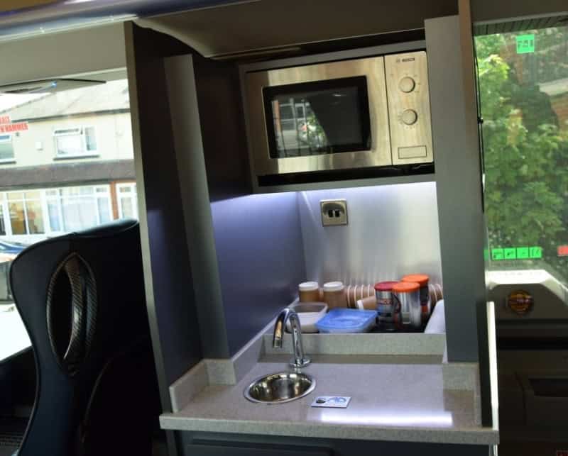 U unutrašnjosti se nalaze i stolovi sa držačima za čaše i dodatnim USB priključcima. Tu su i četiri LCD ekrana sa Sky TV-om, kao i on-board wi-fi. Vozilo posjeduje i toalet, kuhinju sa mikrovalnom pećnicom, aparatom za kafu i sudoperom te čak tri frižidera. Klupskim autobusom će upravljati kompanija Fourway Coaches iz Leedsa, koja već 15 godina snabdjeva Leeds Rhinos sa vozilima i vozačima.