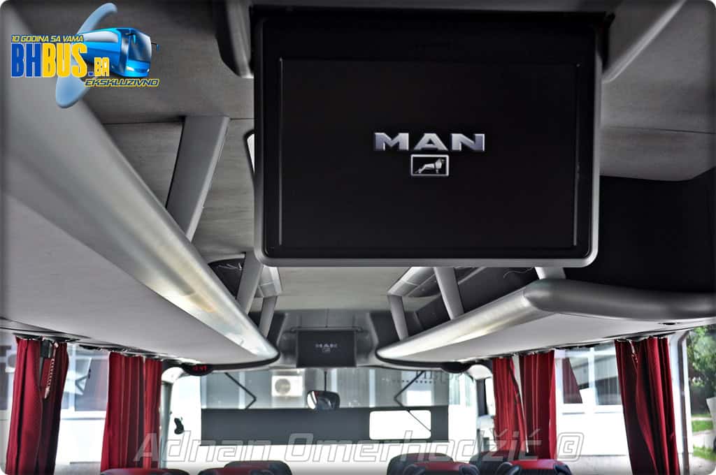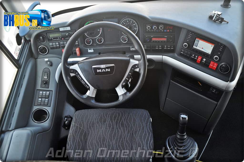 Vozačev prostor je ergonomski, klasični “MANovski”, sa dobro pozicioniranim prekidačima i udobnim sjedištem. Prostorom dominira multifunkcionalni volan sa MAN logom. Vrijedi istaći da vozilo ima dodatnu kameru na zadnjem dijelu vozila kao i unutrašnju kameru za nazdor iznad drugih vrata. Vozilo posjeduje navigaciju, radio kao i inverter te utičnice koje će sigurno dobro doći tokom dužih putovanja.Vozačka postava će svoje odmori moći koristiti i kabini za odmor koja se nalazi iza drugih vrata i koja je opremljena u potpunosti.