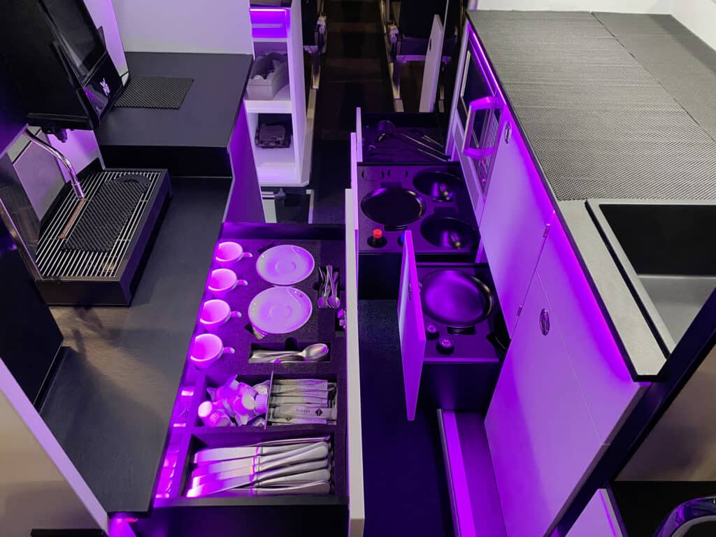 Ekskluzivno opremljeno vozilo sadrži kuhinjski element sa aparatom za pivo, aparatom za kafu sa frižiderom za mlijeko, mikrovalnom pećnicom/konvekcijskom pećnicom, mašinom za pranje posuđa i tri frižidera sa odjeljcima za zamrzavanje. Posebna posuda za ketering održava hranu toplom tokom vožnje. Multimedijalni sistem prenosi video sadržaj na četiri 21-inčna monitora kako bi pružio zabavu i informacije gostima iz biznisa, politike, sporta i šou biznisa. Na svakom sjedištu se nalazi zvučnik.